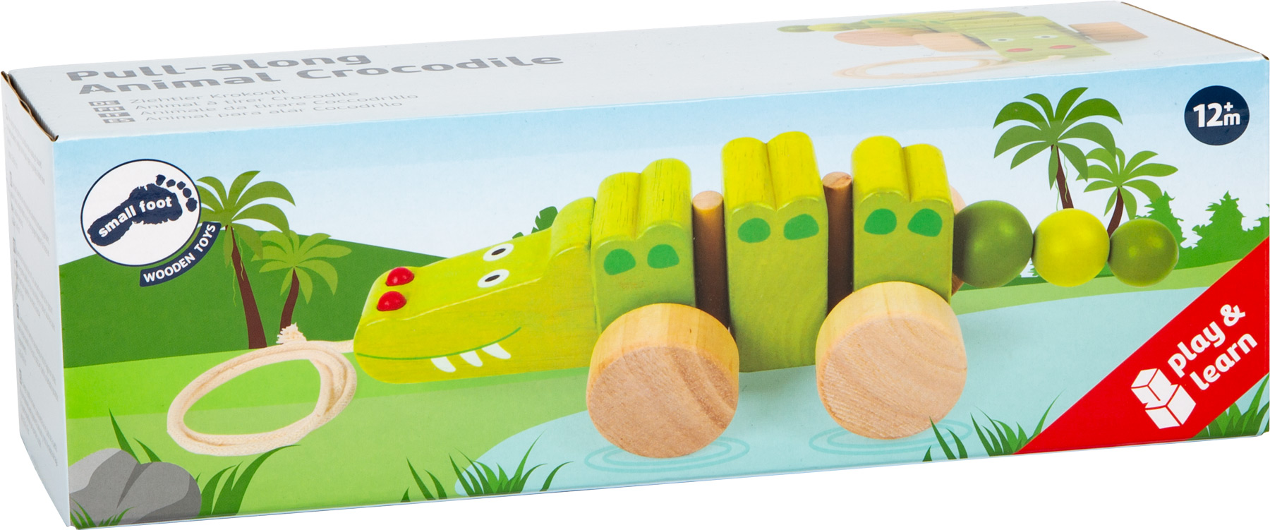 Quand on le tire au bout de son fil, cet amusant crocodile suit en gigotant ! Ce reptile de grande qualité est fait en bois de hêtre non traité et lasuré de couleur. Un super jouet pour apprendre aux enfants à marcher.