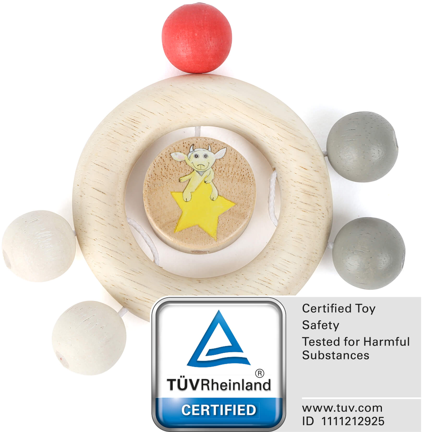 Comme c´est amusant! Ce mignon anneau tient bien en main et grâce à ses perles multicolores bien attachées qui font des bruits intéressants lorsqu´on les secoue, ils éveillent l´attention des bébés. l’adorable Ludwig forme la motricité et ne quittera pas si rapidement les mains des tout-petits. L´anneau est fabriqué en bois de haute qualité et recouvert d´un vernis résistant à la salive. Ludwig a un petit air fort sympathique sur cet adorable jouet pour bébés!