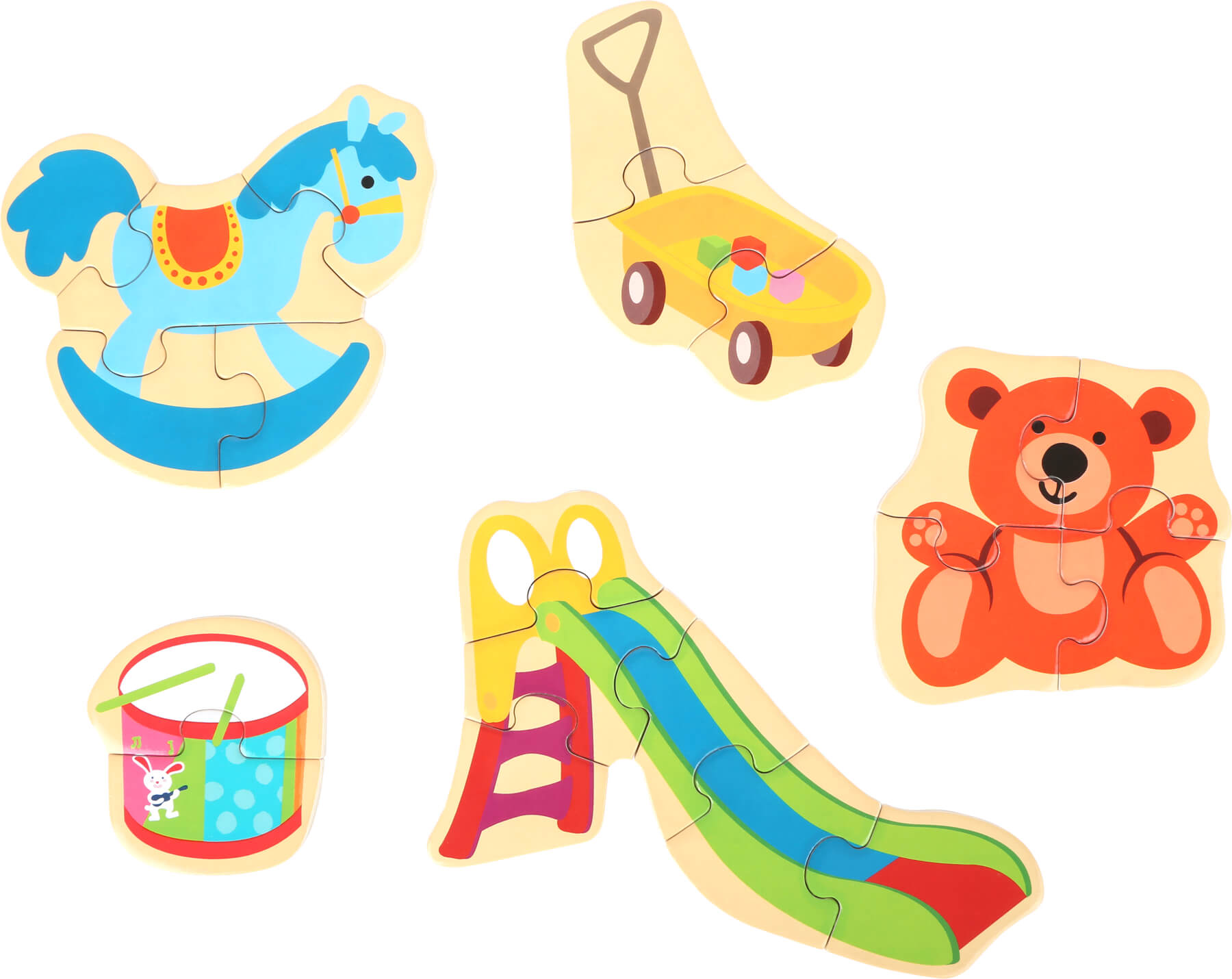Divertissement coloré pour les plus petits! La boîte de puzzles est composée de cinq motifs adorables en 2-6 pièces qui représentent tout ce qui est amusant: cheval à bascule, nounours, chariot, toboggan et tambour attendent d’être mis en place. Les pièces en bois robustes et colorés tiennent bien en main. Le puzzle forme la motricité fine et promet des heures divertissantes. Le plus pratique: Dans leur boîte en bois stable, les puzzles sont faciles à transporter – un beau jeu pour les voyages!