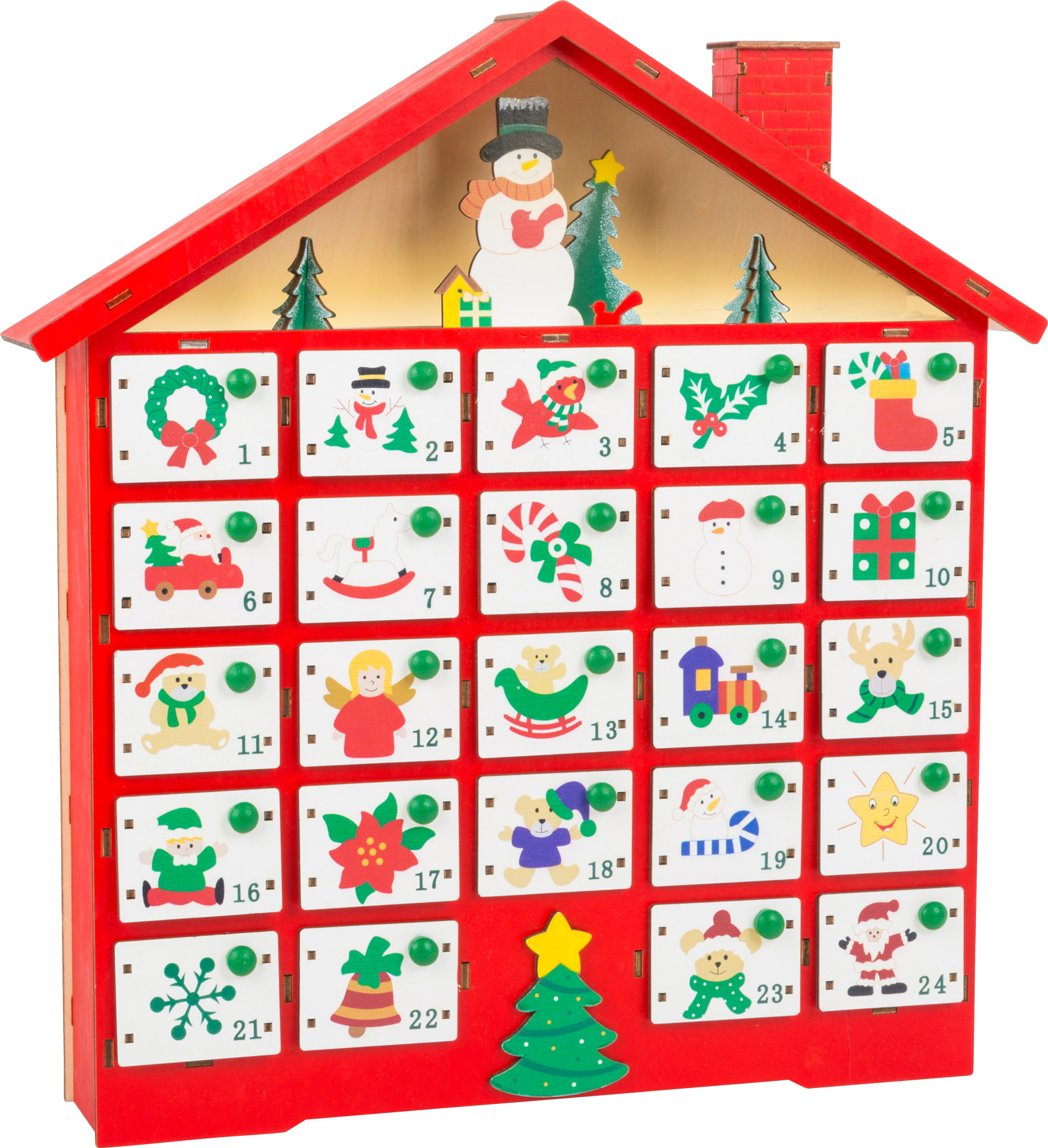 Les 24 petits tiroirs sont ornés de motifs typiques de Noël. L’éclairage LED illumine le chalet. Piles non incluses. Ce calendrier de l’Avent en forme de maison fait briller les yeux des enfants. Qu’est-ce que tu crois qu’il y a dans le premier tiroir ?