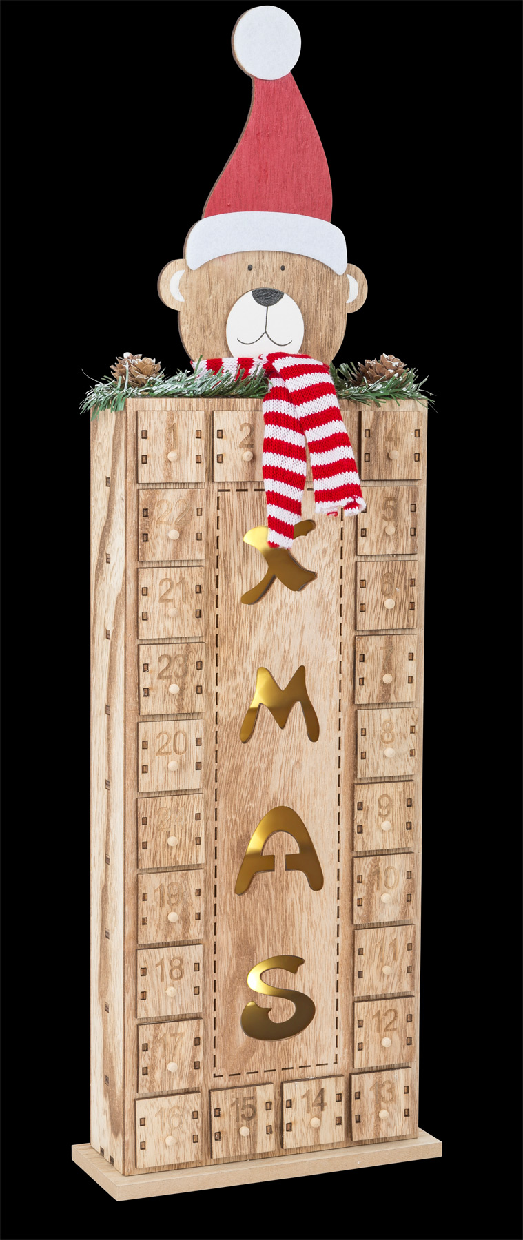 Un ourson en calendrier de l’Avent? Pourquoi pas! Cet ours trône sur le calendrier en bois robuste et règne sur les 24 tiroirs qui dissimuleront vos petits cadeaux. Conçu pour tous types d’intérieur, ce calendrier est muni de petites lampes LED qui illuminent le panneau « X-MAS ». Piles non incluses. Jolie décoration de Noël