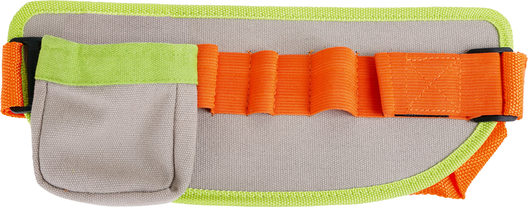 Avec cette ceinture d´outils colorée, les petits ouvriers ont tout ce dont ils ont besoin. Règle, tournevis, marteau, clé, trois vis et cinq écrous sont en bois massif avec vernis en belles couleurs. La ceinture est ajustable à une longueur entre 41 et 103 cm. Pratique pour une petite pause: la boucle à clic de la ceinture robuste en nylon s´ouvre et se referme rapidement.