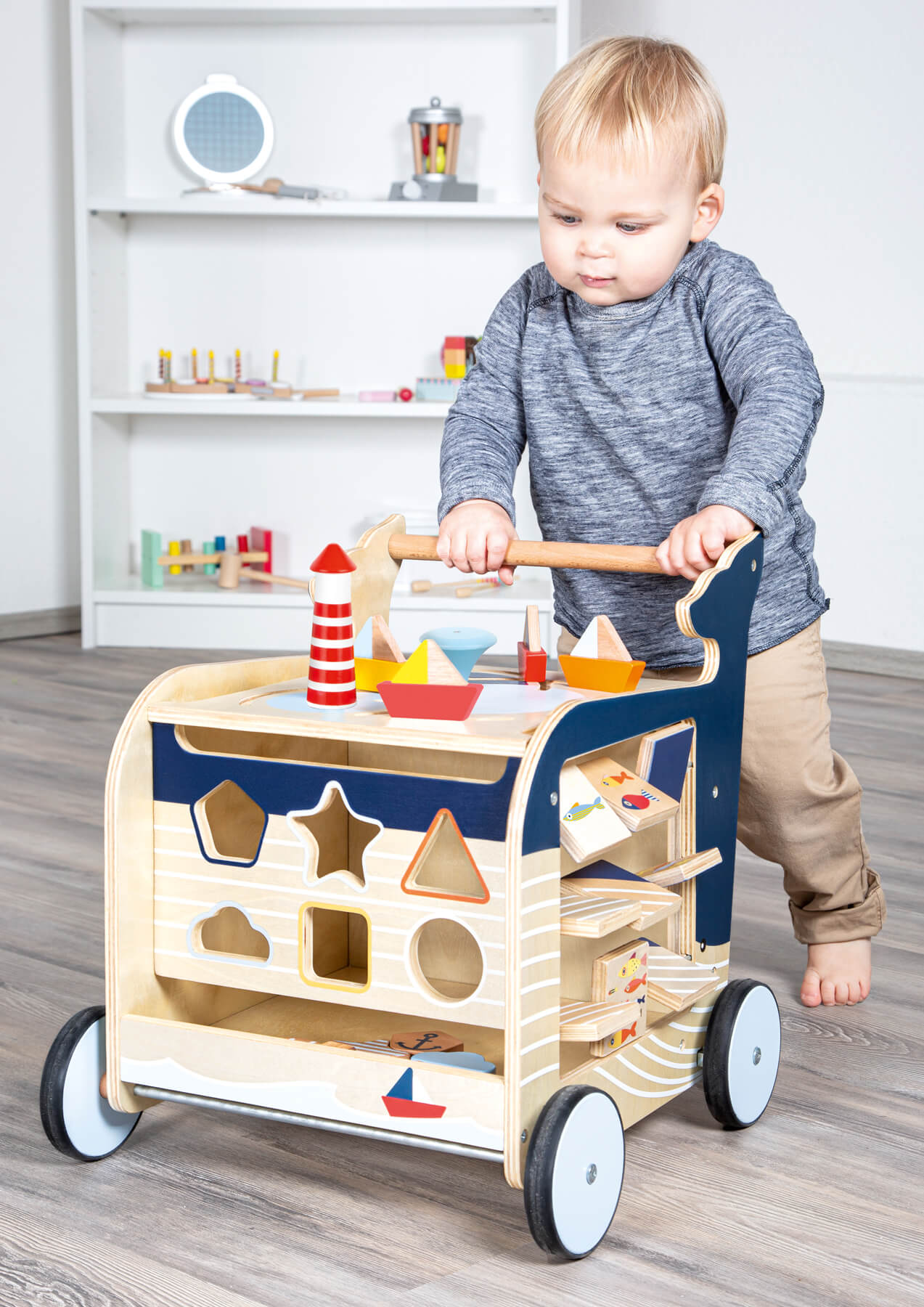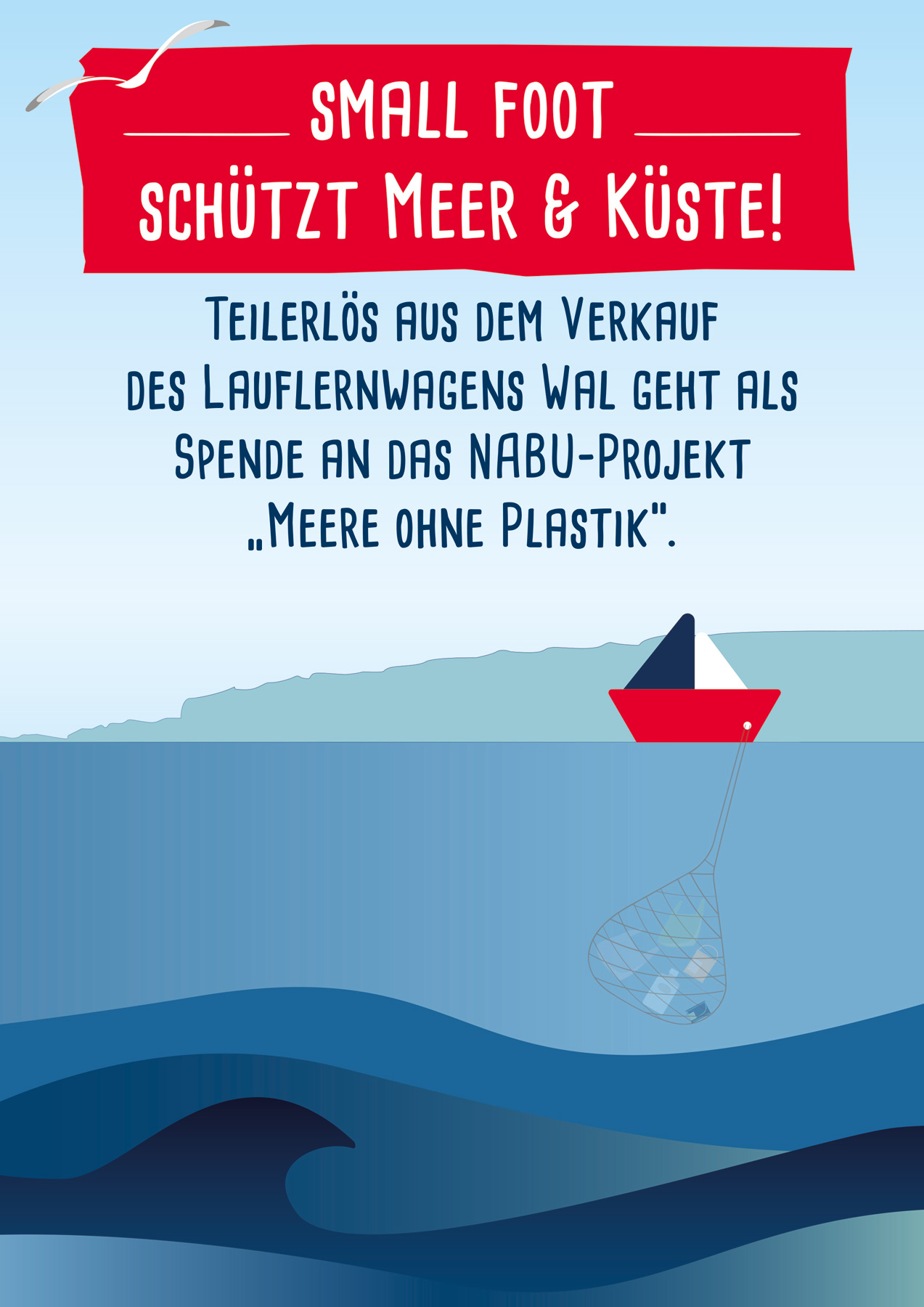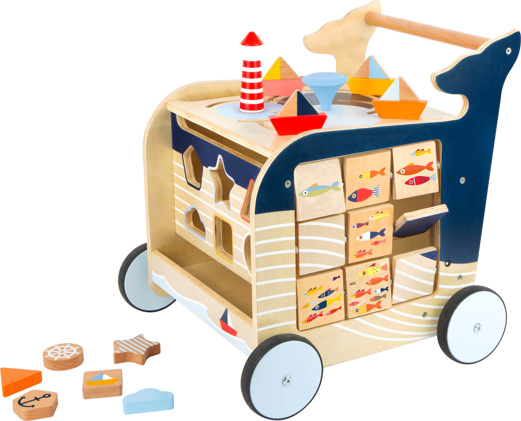 Un voyage de découverte avec la baleine ! Sur cinq côtés jouables, ce chariot de marche en design d’une baleine en bois, nominée pour le ToyAward 2020, offre aux débutants une abondance de jeux et de plaisir d´apprentissage. La mer et ses habitants sont l’élément central de son design – ainsi les enfants développent leur compétences tout en emboîtant, poussant et pliant, et l´habitat de la baleine est exploré de façon ludique! Les poissons aident à compter et une boussole aide à comprendre la direction et les saisons. Les petits roulent en toute sécurité et silencieusement sur des roues caoutchoutées. Sous le couvercle à charnière avec protection anti-pincement, il y a de la place pour les éléments enfichables et les jouets. Le système de freinage permet de pousser le chariot sur le sol de manière contrôlée. Avec axe continu. Un tableau noir encourage les enfants à devenir créatifs avec de la craie ! Un compagnon de jeu pratique pour les débutants, qui convainc petits et grands par son design attrayant et qui est un véritable multitalent en termes de valeur ludique et de protection de l’environnement ! Une partie des recettes de sa vente sera reversée au Naturschutzbund Deutschland e.V. (Société allemande pour la conservation de la nature) et sera utilisée pour le projet « Des océans sans plastique », qui organise entre autres des campagnes de nettoyage des plages et des berges. Ainsi, la NABU s’engage activement et préventivement pour la protection des océans du monde et de leurs côtes et contribue de manière décisive à la préservation de l’habitat de tous les habitants de la mer.