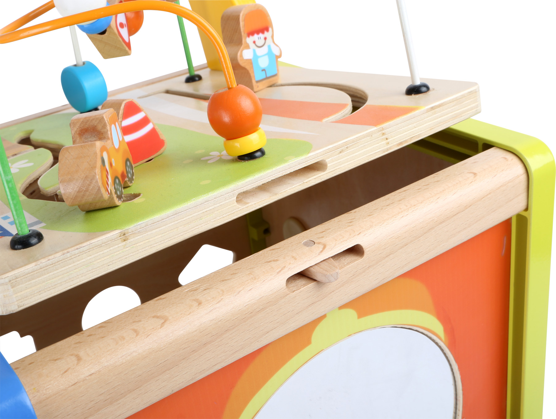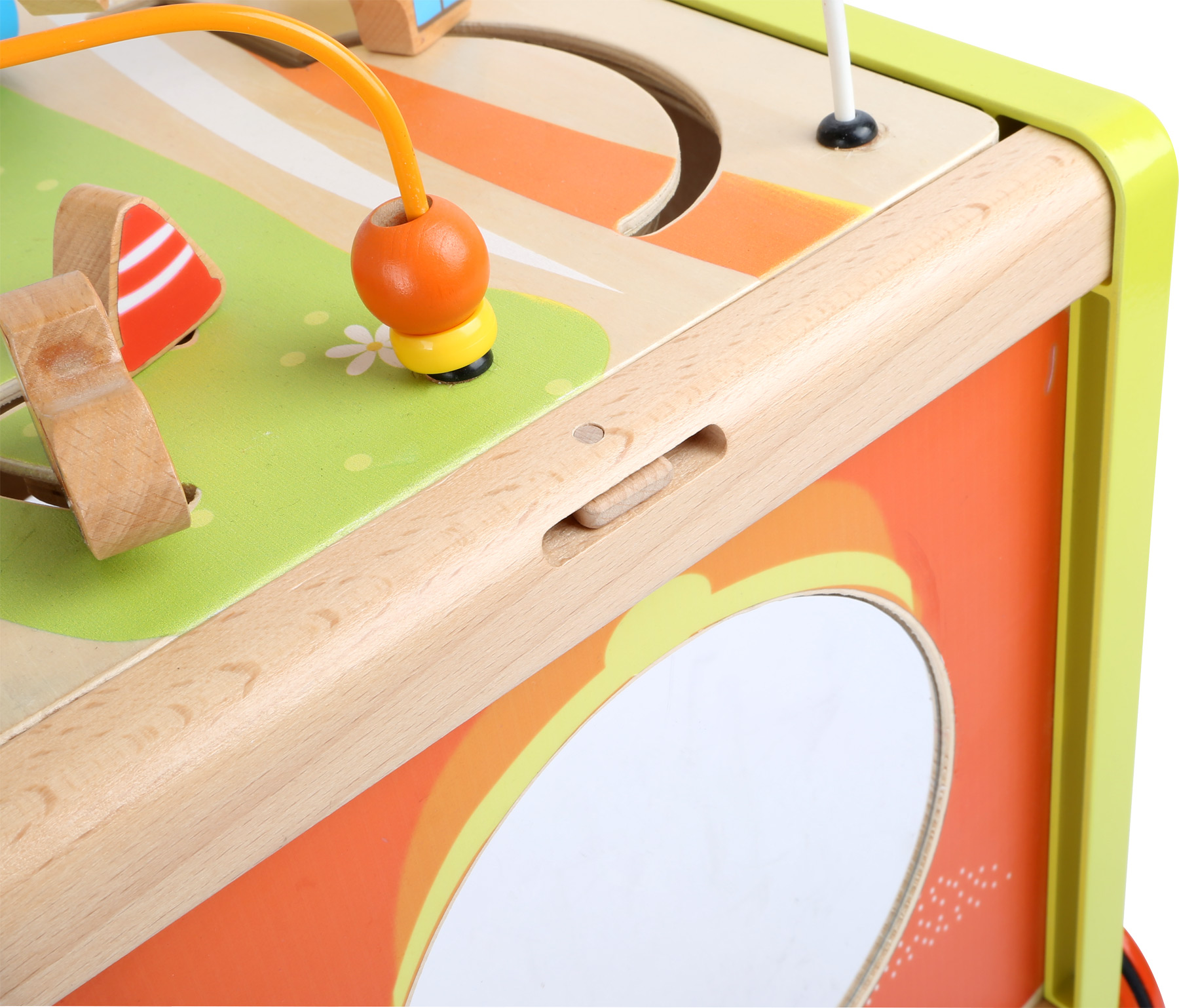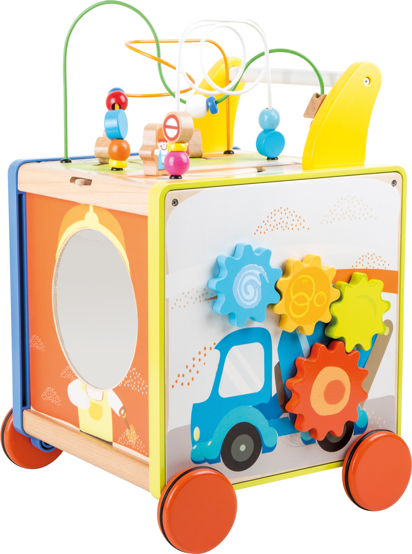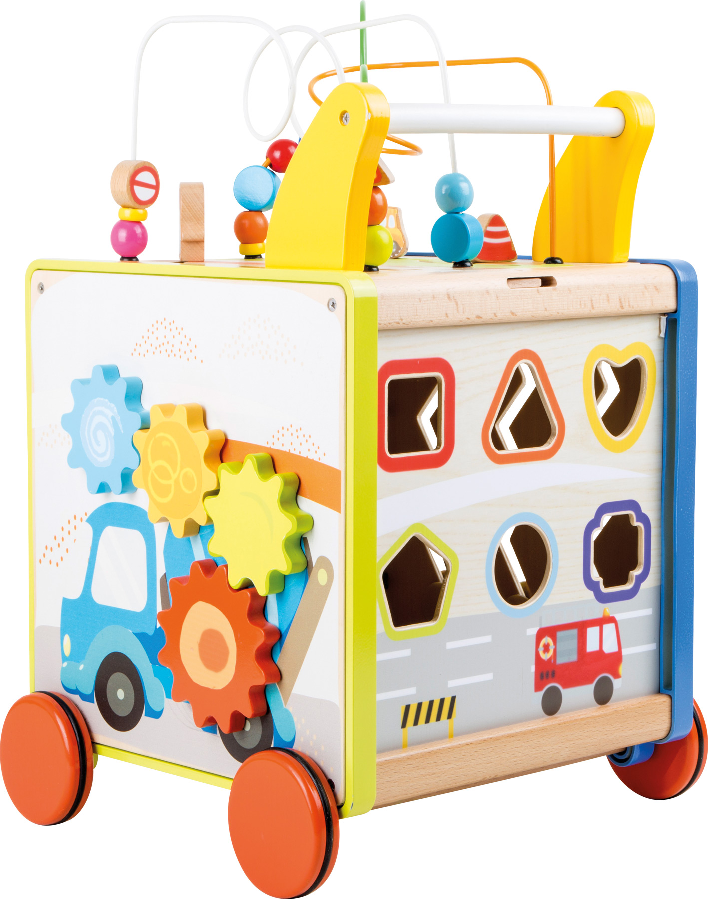 Ce chariot de marche en bois améliore de façon ludique les capacités motrices de l’enfant. Qu’il s’agisse d’engrenages, d’éléments enfichables ou de circuits de motricité, aucun enfant ne s’ennuie ici. Les pneus glissent silencieusement sur le sol grâce aux pneus en caoutchouc. Le chariot sert également d’espace de rangement.