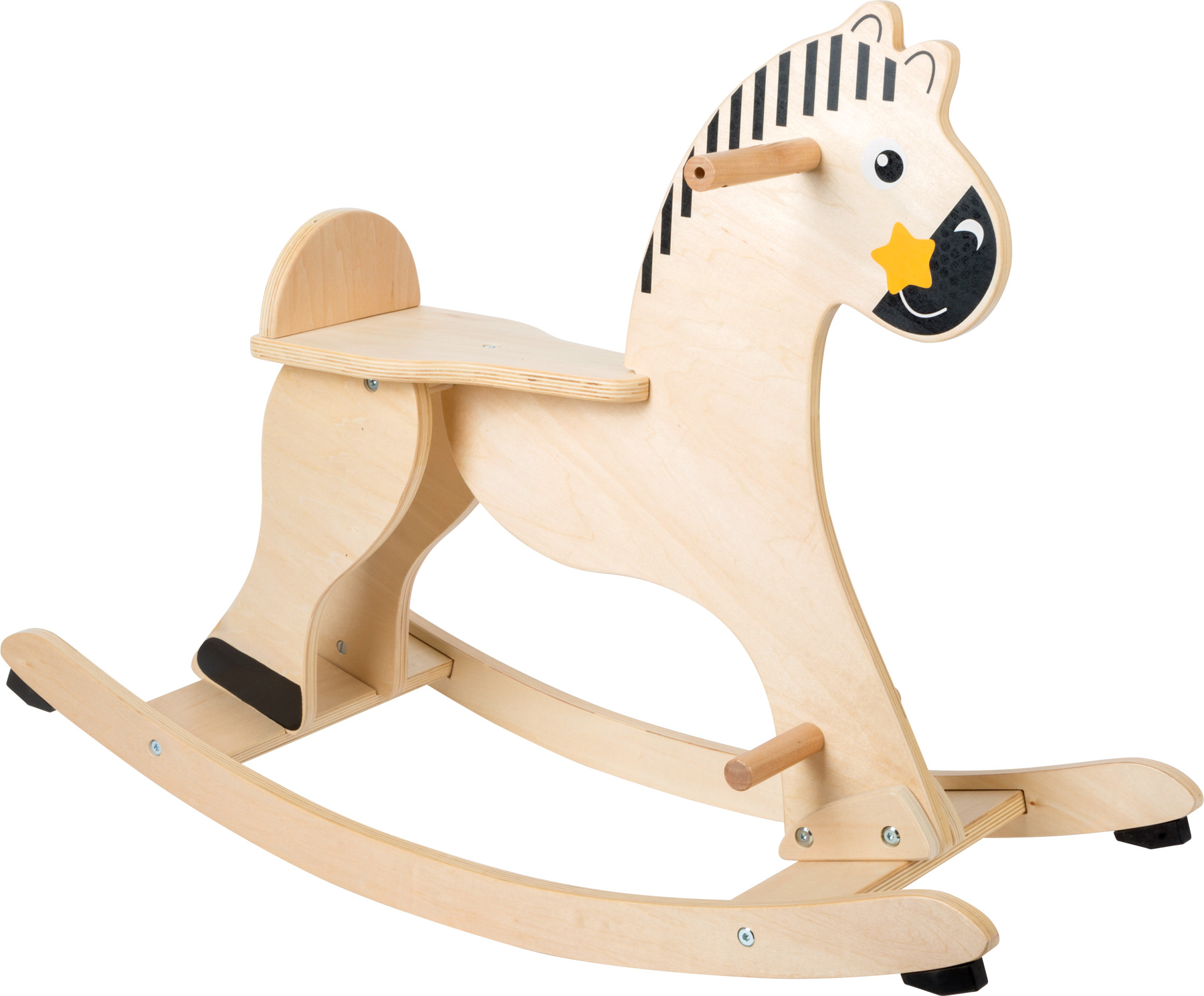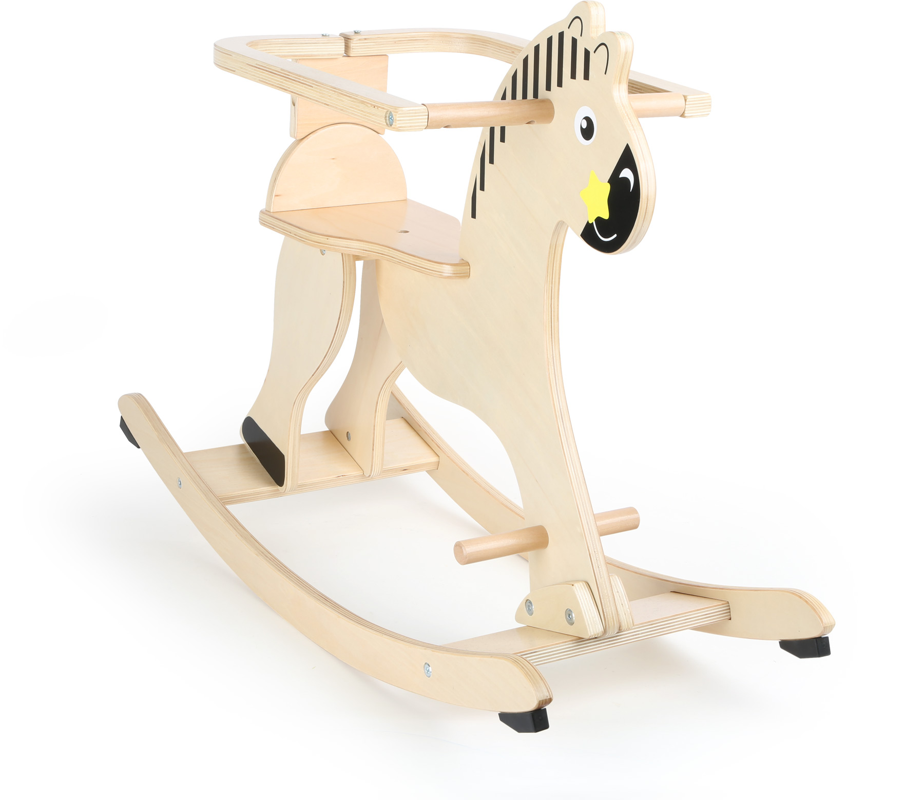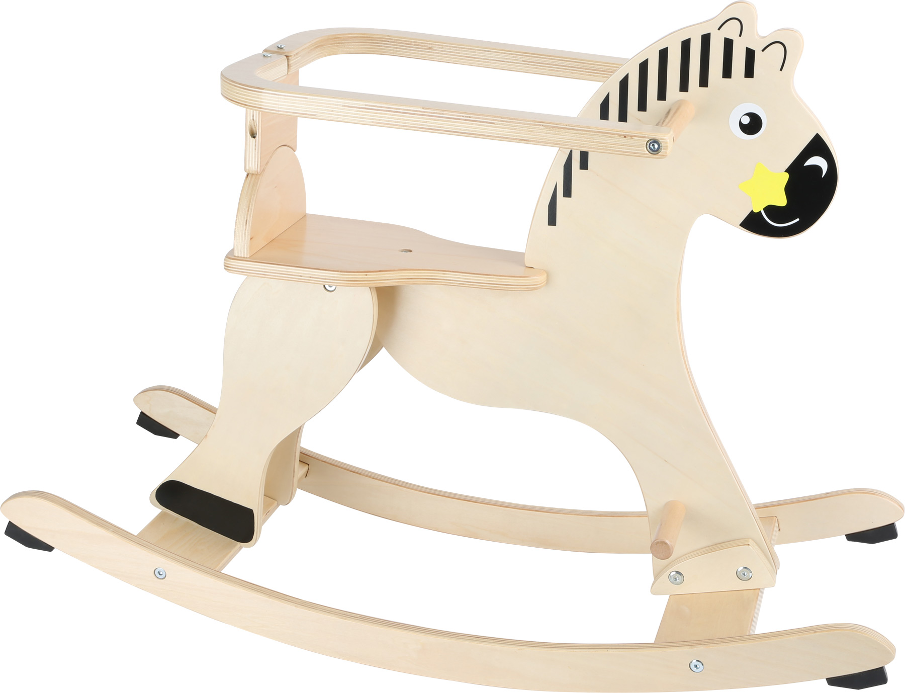 A cheval sur mon baudet! Ce cheval à bascule est tout ce dont les enfants rêvent! Pour que les petits cavaliers restent bien en selle, le cheval à bascule possède un anneau de protection amovible. Ce cheval à bascule stable convainc par son design classique. L’anneau de protection amovible et les bords arrondis des lamelles en bois permettent de se balancer en toute sécurité. Ainsi, il est impossible de tomber! C’est parti pour un grand amusement à cheval!