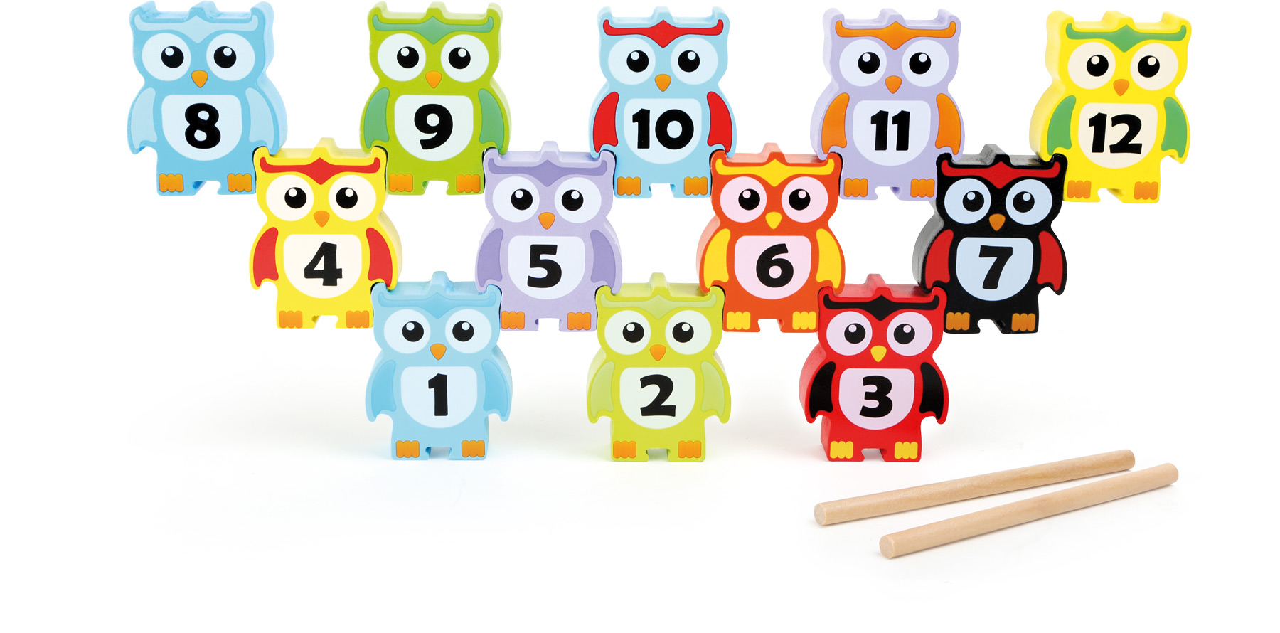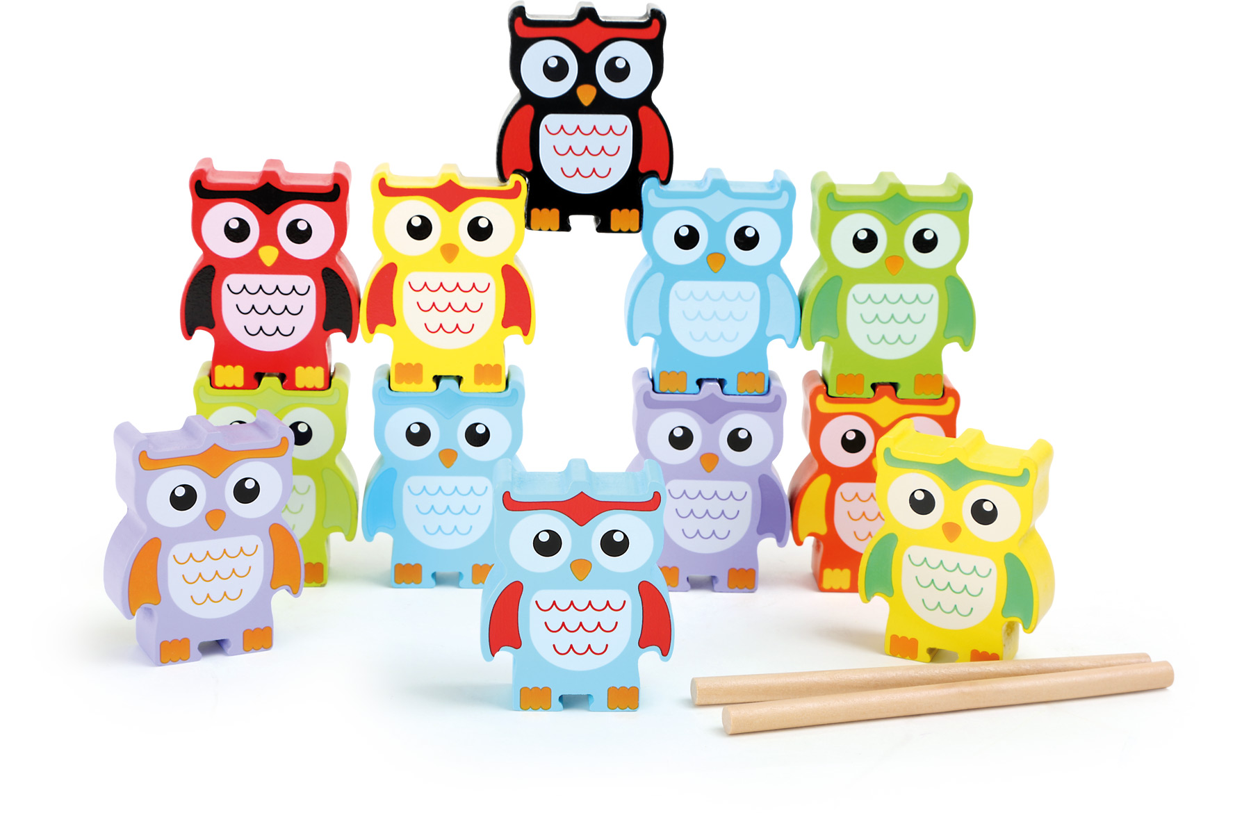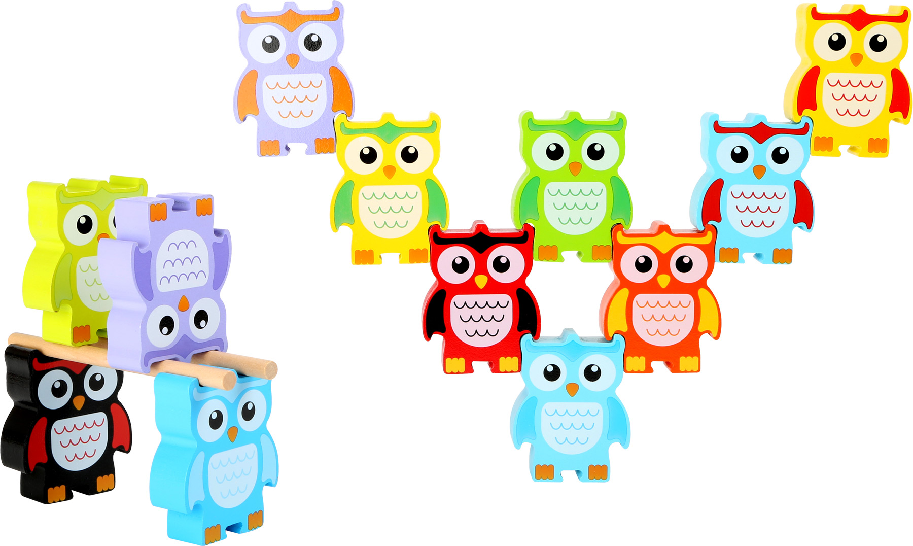 Calculer avec une main calme ! Ces chouettes en bois peint en détail veulent prendre de la hauteur. Elles donnent la possibilité de construire des pyramides, des tours ou des œuvres d’art en équilibre dans des formations variées ou d’après les chiffres. De fines encoches adaptées sur les ailes, les pieds et la tête des chouettes permettent d’empiler les joyeux oiseaux. Lorsqu’on utilise les deux bâtons en bois, le jeu devient plus difficile. Les chouettes à empiler entraînent la concentration et la motricité fine et donnent le sens de l’équilibre et de la force de gravité. Parfait pour faire des expériences, pour faire des calculs et bien plus encore – un jeu qui met de bonne humeur !