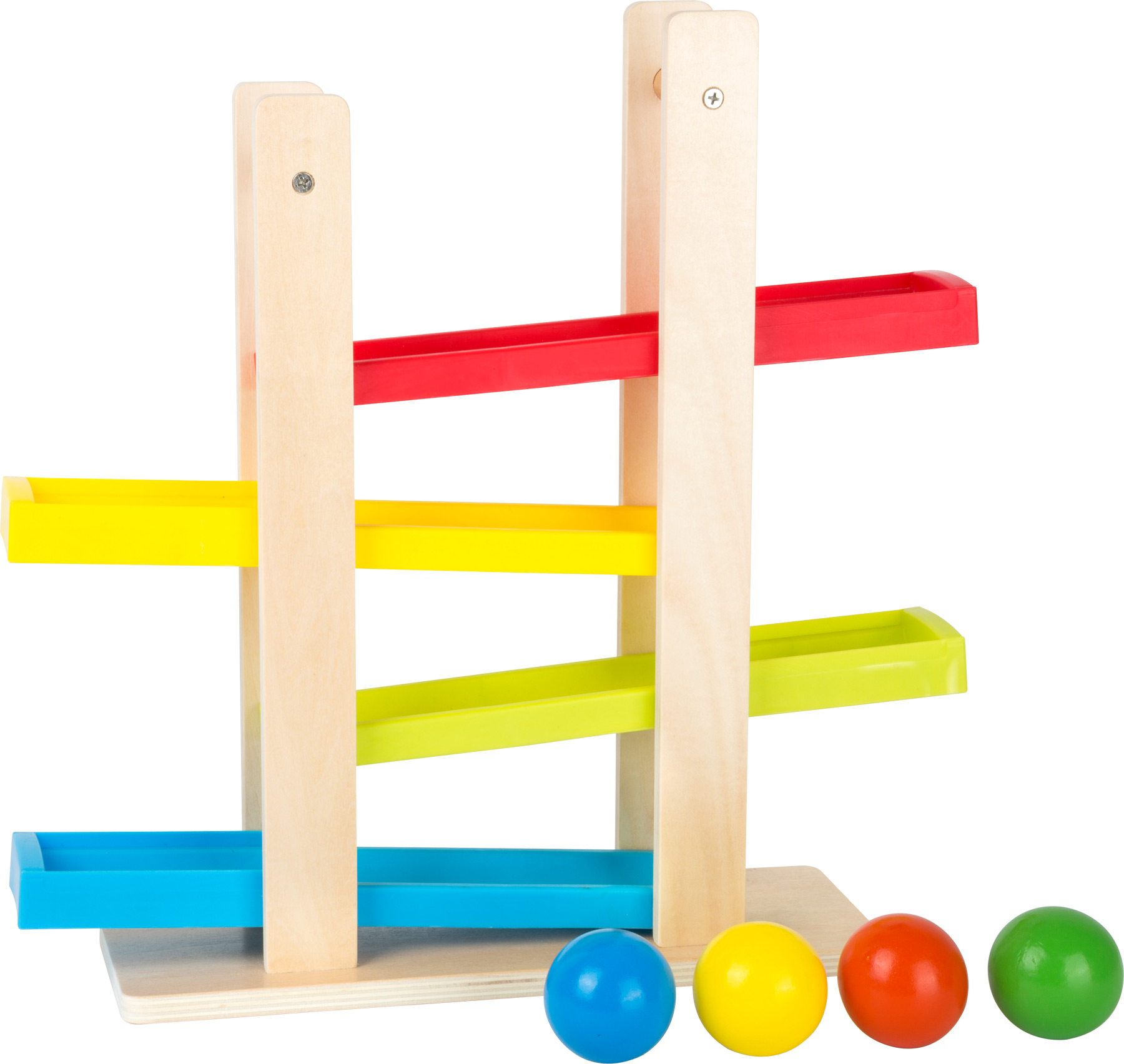 Les voilà qui tournent ! Ce circuit à boules en bois est un grand plaisir sur les petits espaces de jeu. Les 4 grosses et robustes boules de bois descendent le long des pistes de plastique colorées et sont ensuite remises sur la ligne de départ pour une nouvelle descente. Plaisir de jeu garanti!