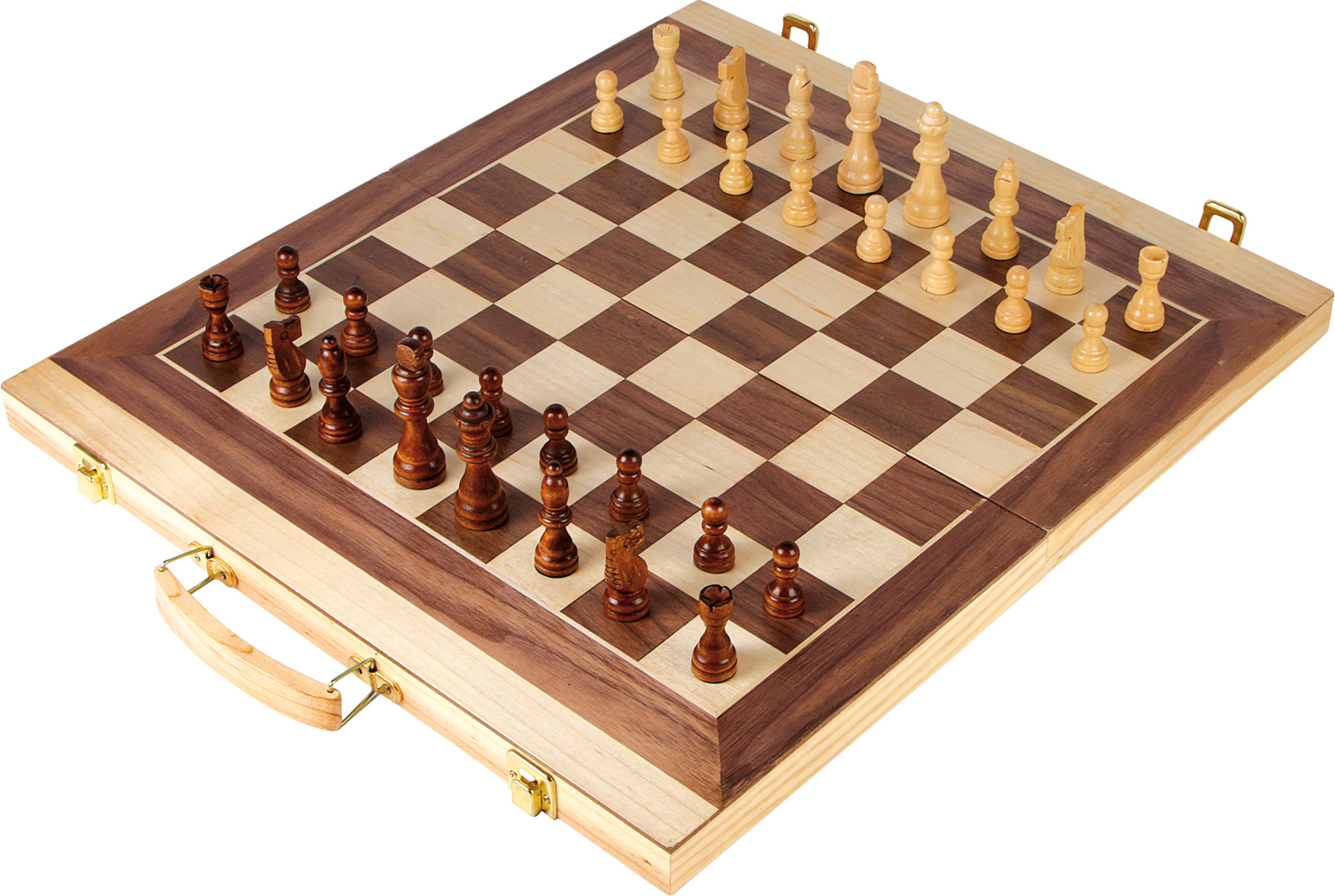 Coffret soigneusement travaillé avec marqueterie dans le couvercle et poignée. Pions en bois de 3,8 x 0,7 cm et figurines de 3,5 à 7,5 cm pour les jeux d’échecs, jacquet et dames.