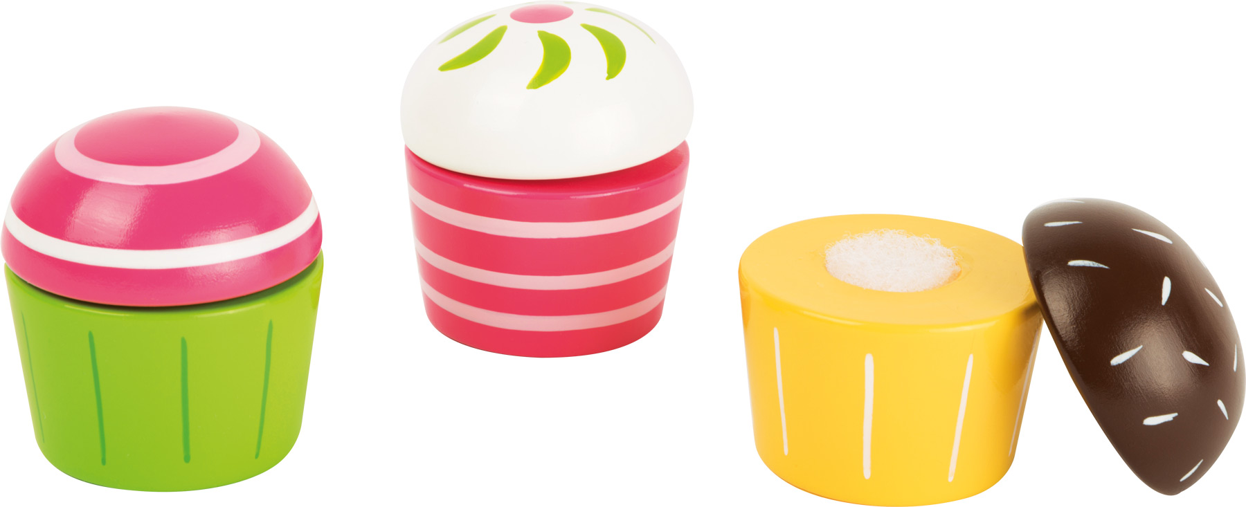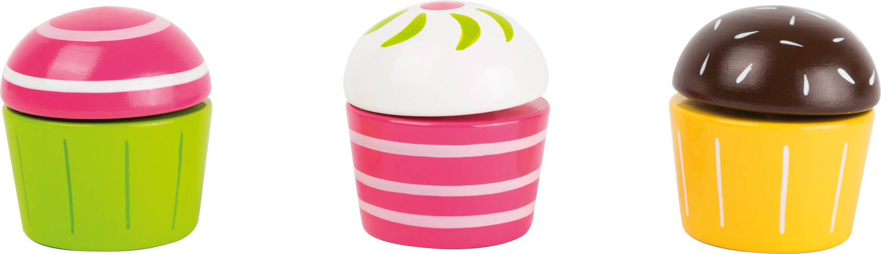 Avis aux pâtissiers! Ces 3 cupcakes en bois massif certifié FSC® 100% peuvent être merveilleusement combinés les uns aux autres grâce à la séparation par velcro. Sur le comptoir de vente de la boutique du marchand, ils attirent vraiment l’attention ! Ici, les muffins peuvent être servis et présentés de manière excellente avec des garnitures amovibles, sur des étagères ou des plateaux. Ces délices ne devraient pas manquer dans la boutique du marchand pour enfants.