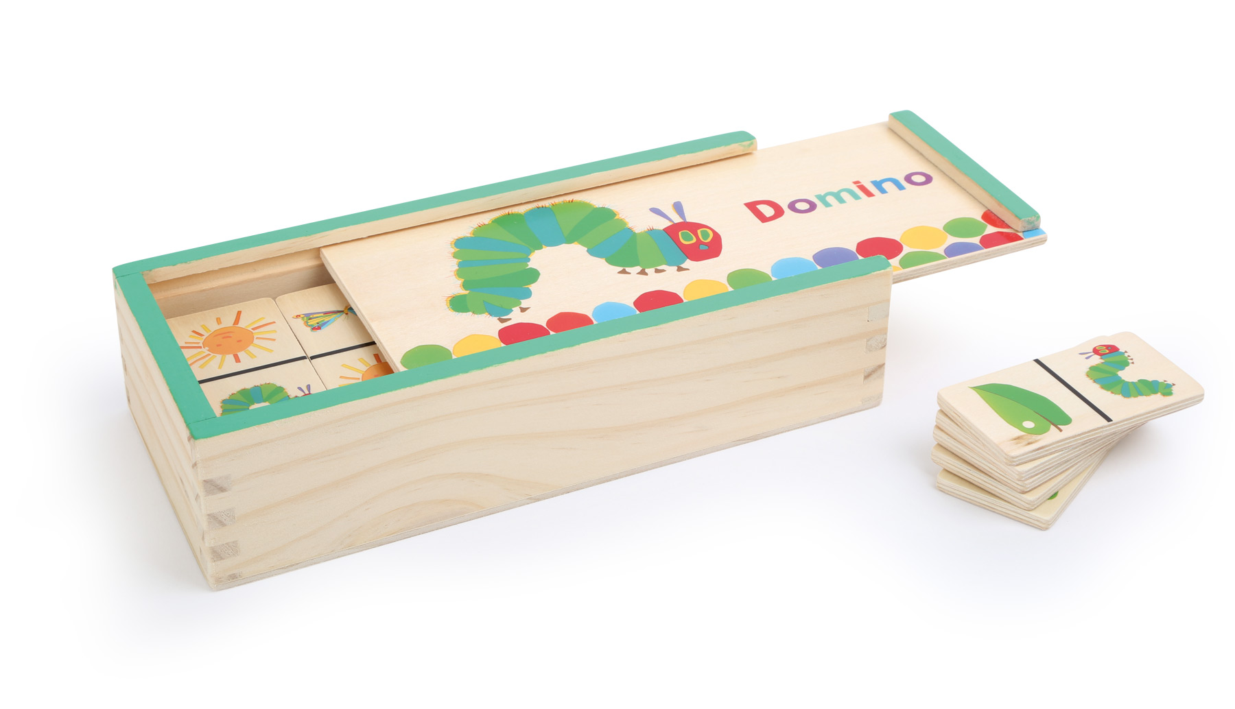 La chenille qui fait des trous, connue du livre pour enfants d´Eric Carle, décore ce superbe jeu classique de Dominos – qui ne le connaît pas ? Il faut toujours associer les mêmes paires, et celui qui a étalé toutes les pièces a gagné ! Dans une solide boîte en bois pour un rangement et transport facile.