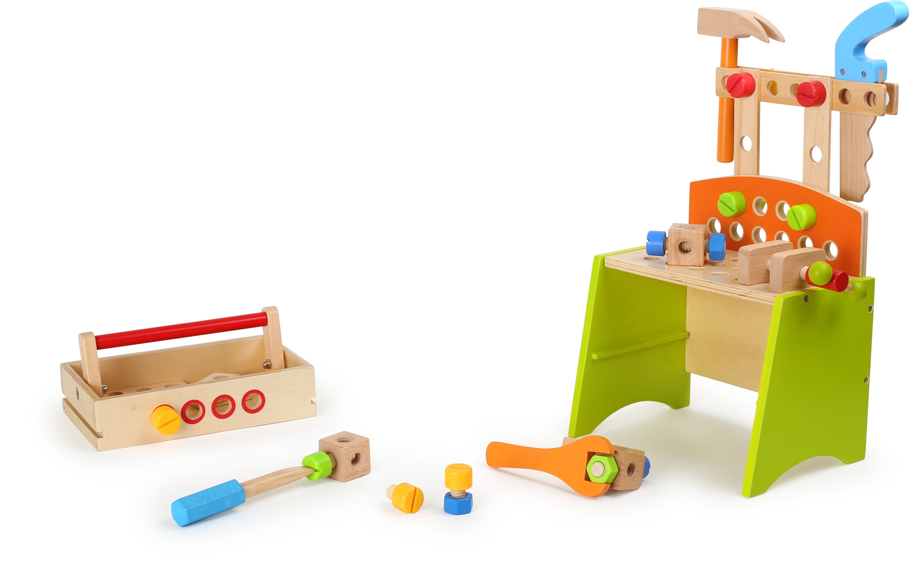 Les futurs artisans peuvent exercer leur adresse et leur savoir-faire à cet établi à applications multiples: visser, percer, marteler et scier. On y trouve même un étau – comme l´original pour les adultes.
