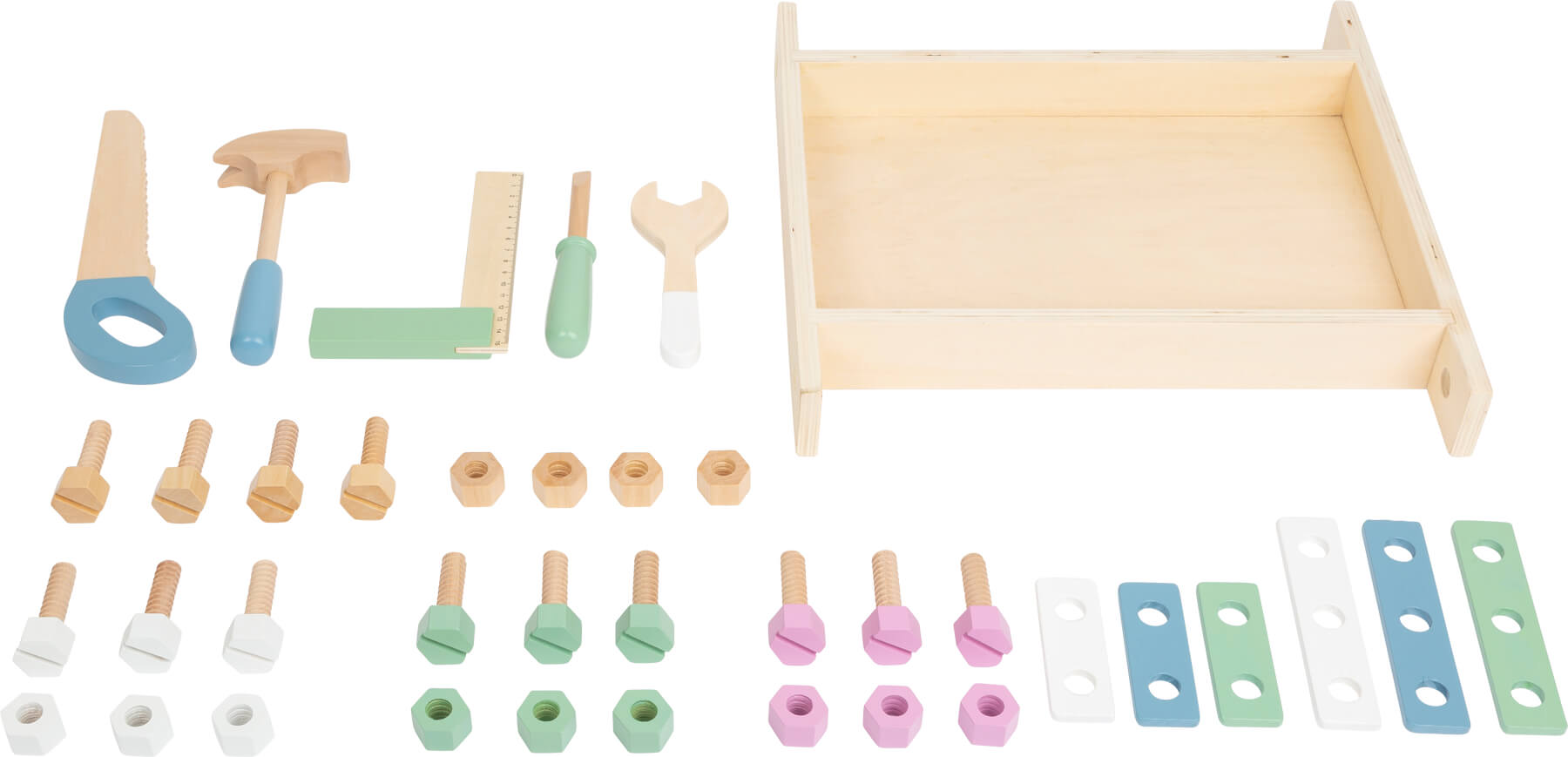Des couleurs douces, des formes présices, des matériaux naturels, voilà le design nordique! Avec ce robuste établi en bois, garçons et filles apprennent leurs premières activités de bricolage de manière ludique. Les 5 outils différents et les 24 accessoires forment également la motricité fine. Étau inclus. Accessoires composés de 9 vis, 9 écrous et 6 bandes perforées. Les enfants peuvent déjà aider à la construction et prouver leurs compétences manuelles. Grâce à son design scandinave aux couleurs discrètes, cet établi convient à tout type d’ameublement. Pour les filles aussi bien que pour les garçons un jouet de jeu de rôle approprié.