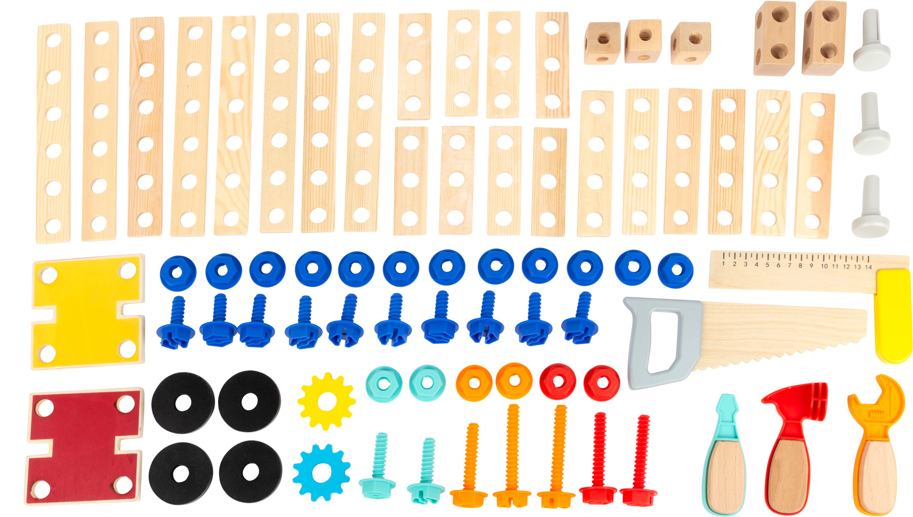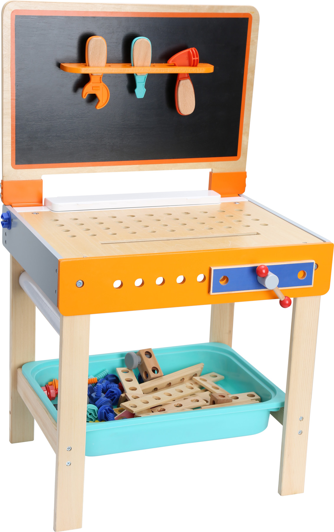 Ici, les constructeurs comme les artistes trouveront leur bonheur! Soit il sert d’établi fonctionnel avec des outils pratiques, ou alors il sert de table à dessiner rationnelle – les deux variantes sont disponibles pour les petites têtes créatives. Marteler, visser, scier ou dessiner, tout est possible! Cet établi robuste convainc par ses nombreux accessoires, de la scie en bois jusqu’à la vis en plastique solide. La face arrière peut facilement être repliée et sert de table à dessiner! Le rouleau de papier se cache en dessous de la table et se déroule sans problèmes. Un beau jeu pour la chambre d’enfant!Une boîte de crayon est fournie avec cet établi permettant aux patits architectes de dessiner leurs plans.