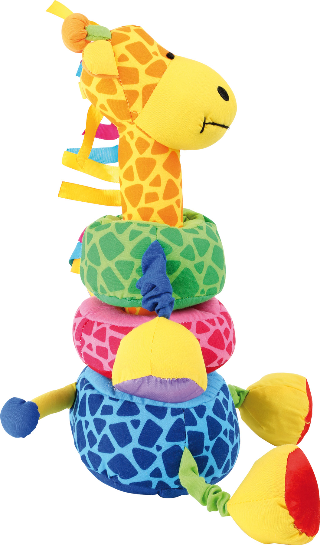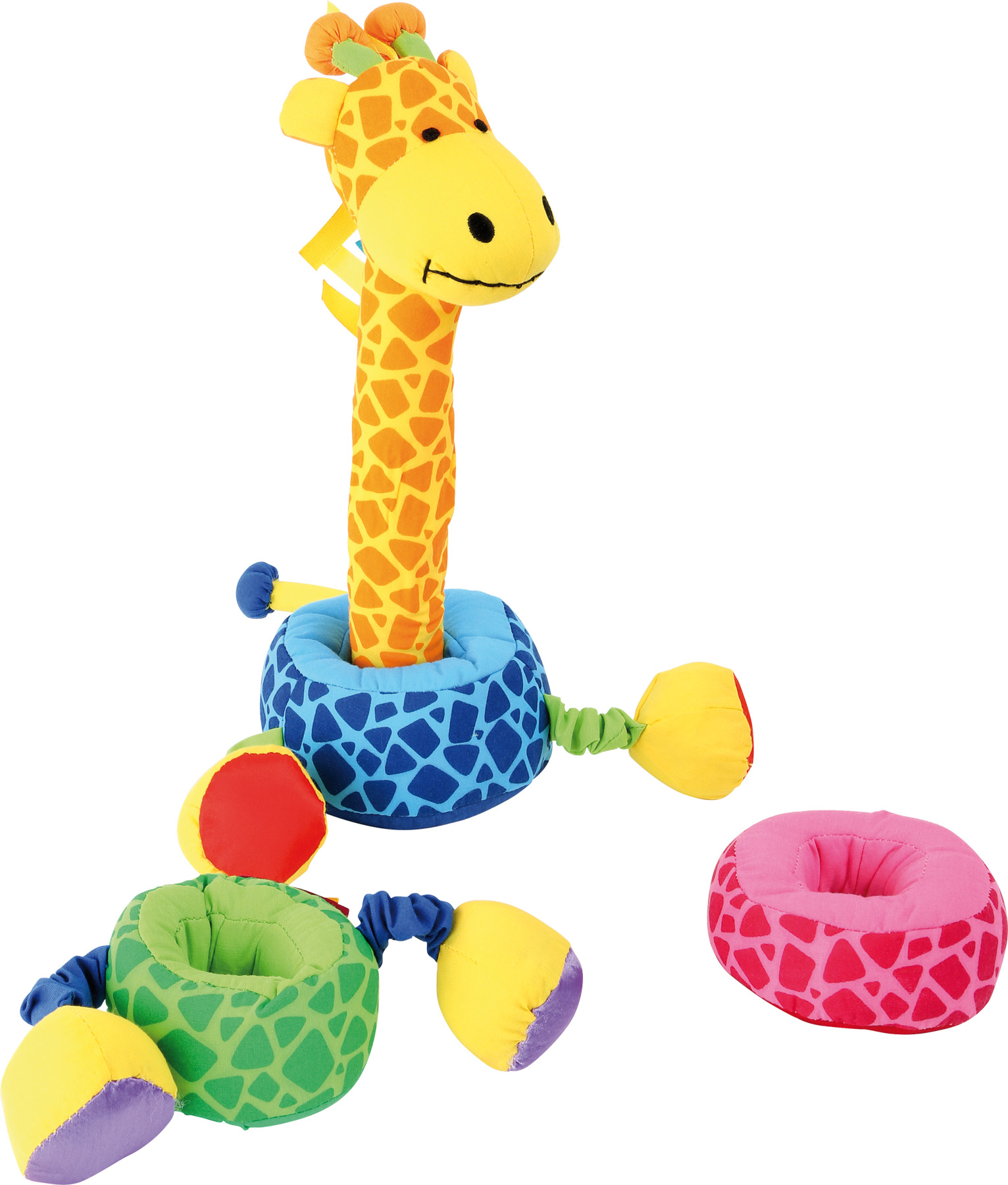 Un superbe jeu à emboîter pour les tout-petits que cette combinaison de mousse et de tissu! Un anneau est fourré de papier crissant, les membres sont munis d‘élastiques. En apppuyant sur les pattes, la giraffe émet des sons.
