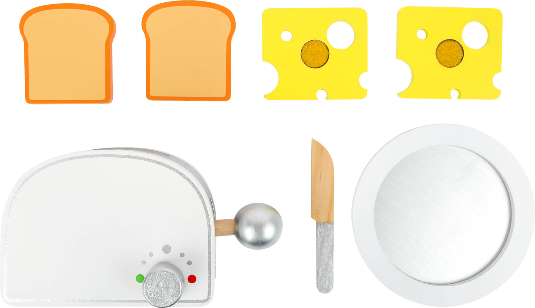 Le petit déjeuner est prêt! Avec ce grille-pain compact, le petit déjeuner est encore plus amusant. Les tranches de pain sont grillées jusqu’à ce qu’on les sortes avec la manette mobile et qu’elles atterrissent sur l’assiette avec une tranche de fromage. Le grille-pain compact en bois stratifié massif satisfait les plus exigeants. La manette sort les tranches de pain et les place sur la bonne assiette. Le fromage est attaché à la tranche de pain avec du Velcro est peut être séparé avec un couteau en bois. Le bouton rotatif, avec bruit de craquement sur le côté montre si le grille-pain est allumé ou éteint. Et maintenant: Amusez-vous bien avec ce grille-pain!