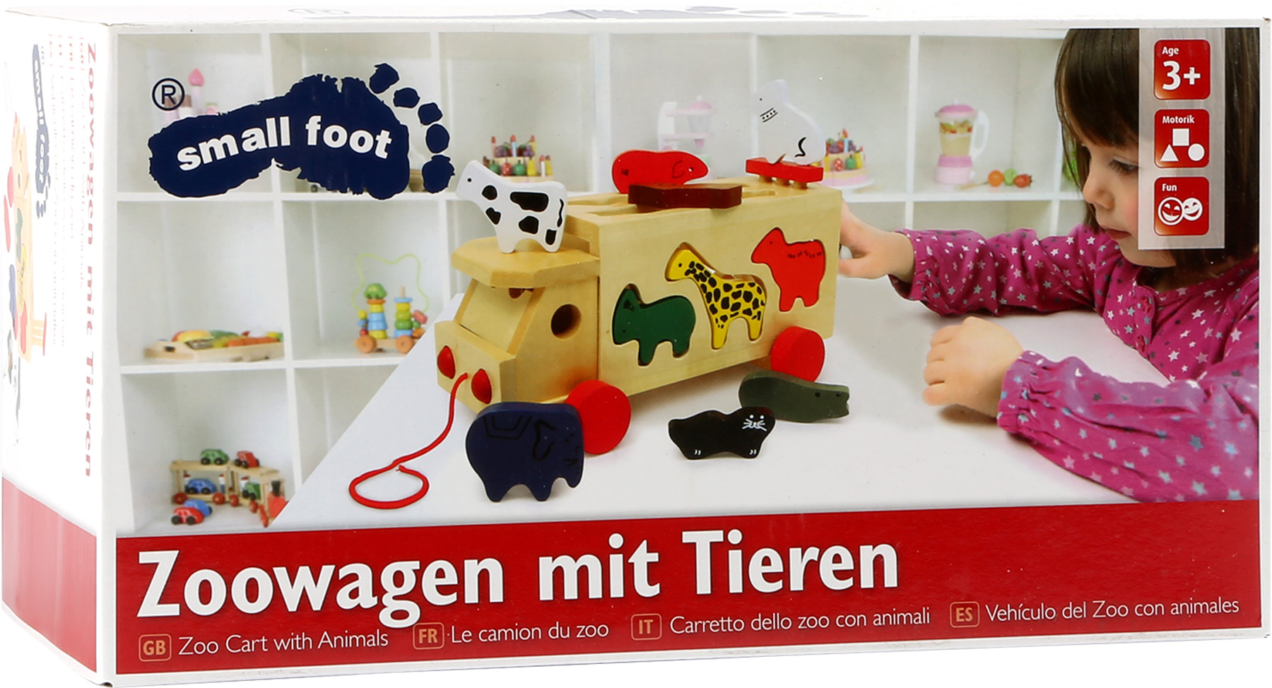 Qui vient faire un tour au zoo? Ce camion du zoo avec ses phares et roues rouges offre de la place pour dix animaux en bois colorés avec détail. Girafe, éléphant et autres entrent par les ouvertures correspondantes et peuvent être tirés à travers la chambre d’enfant dans leur camion par la corde. Lorsqu’ils arrivent, ils descendent par la grille mobile à l’arrière du camion. Le camion du zoo est un beau jeu pour entraîner la motricité et permet aux petits de faire connaissance avec les animaux sauvages.