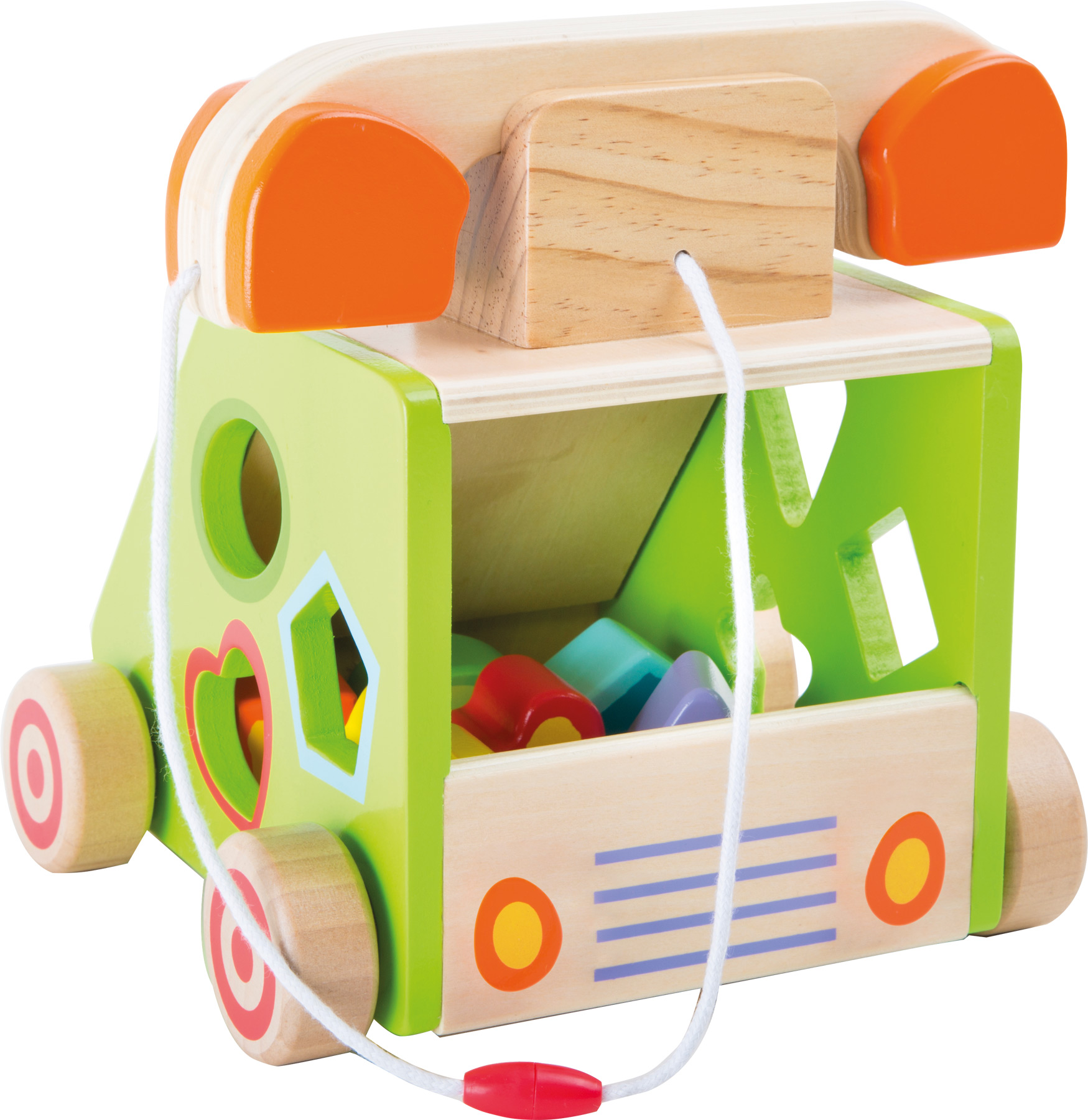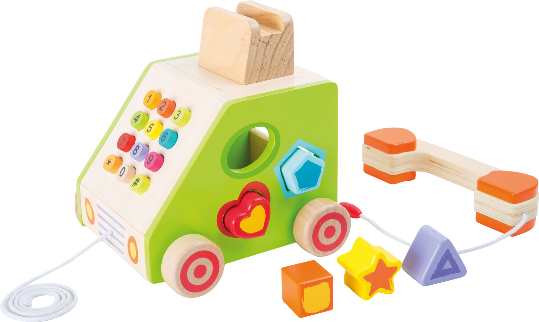 Un téléphone non pas portable, mais roulant, fabriqué en bois massif, accompagne les petits enfants lors de leurs premières balades de découverte. Lors d’une courte pause, il est possible d’insérer les différents blocs en bois dans les formes prévues à cet effet. Il est possible d’appuyer sur les chiffres.