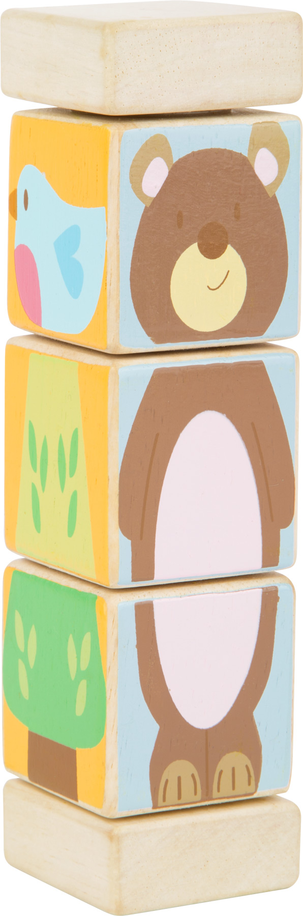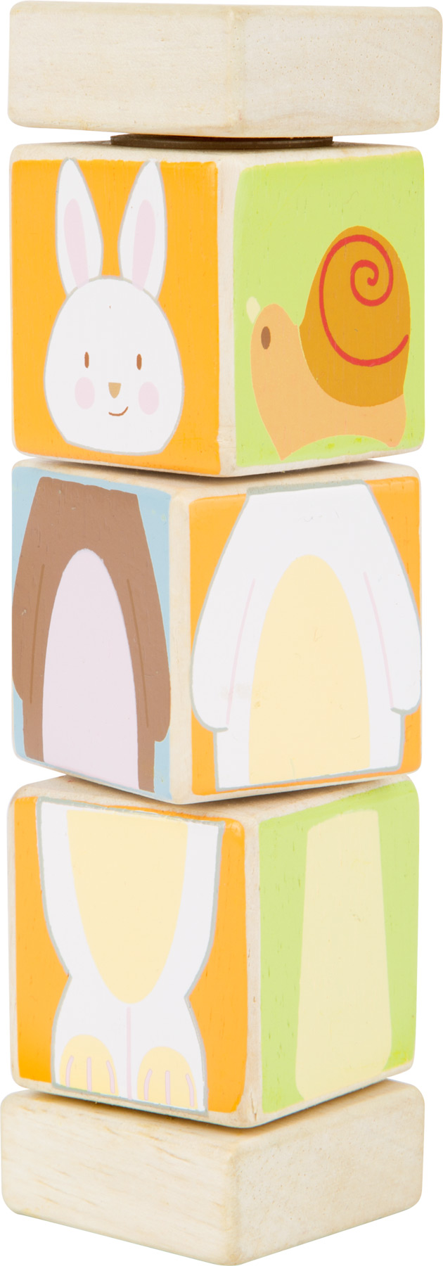 Regardez, un lapin-ours! Avec cette tour en bois les différents motifs peuvent être combinés de façons toujours nouvelles. Le jouet permet de former l’habileté tout en jouant. Les éléments en bois stables se tournent facilement sur eux-mêmes et créent à chaque fois des nouvelles combinaisons. Un beau jouet de motricité pour la route!