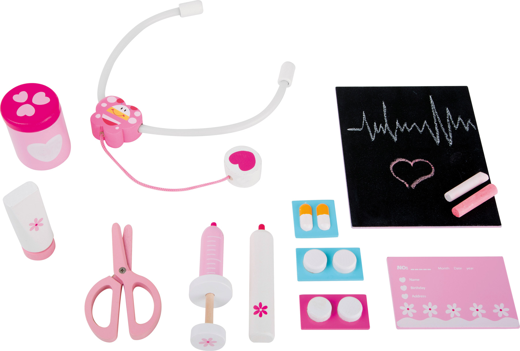 Patient suivant s’il vous plaît ! Ce kit de docteur aux couleurs pastel douces avec des petits motifs décoratifs est un bon équipement de base pour les futurs docteurs dans la chambre d’enfant. Il comprend un stéthoscope, seringue, ciseaux, comprimés et une carte d’ordonnance. Un petit tableau avec de la craie rose et blanche sert à noter les résultats d’analyse. Avec le kit de docteur papillon, les enfants peuvent faire leurs premières expériences de jeux de rôles. La consultation peut commencer !