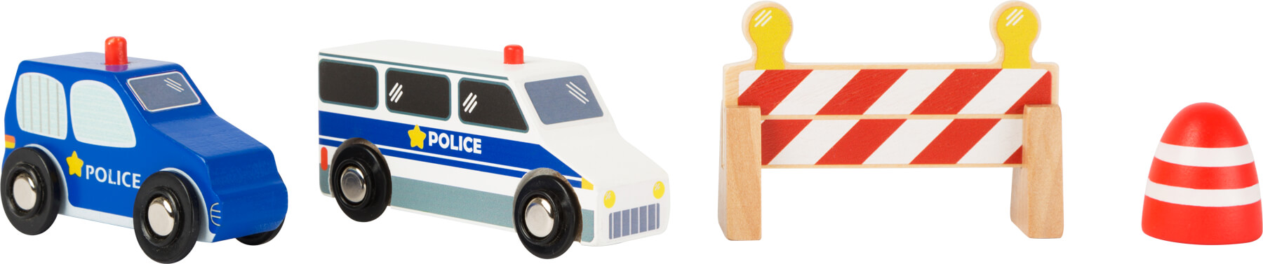 Arrêtez-vous! Contrôle routier! Le kit de police de notre univers de jeu small foot world contient des signalisations et deux voitures de police en bois verni certifié FSC® 100% et promet un divertissement plein d’action. Mets en place un barrage avec la camionnette de police et les panneaux de signalisation et sécurise-le avec des pylônes – les contrôles peuvent commencer. Seuls les conducteurs qui respectent les instructions peuvent passer! Le kit de police promet des aventures superbes et complète le kit de route et les autres produits de notre gamme small foot world! Veuillez noter que l’ancienne référence de cet article est le: 10804.