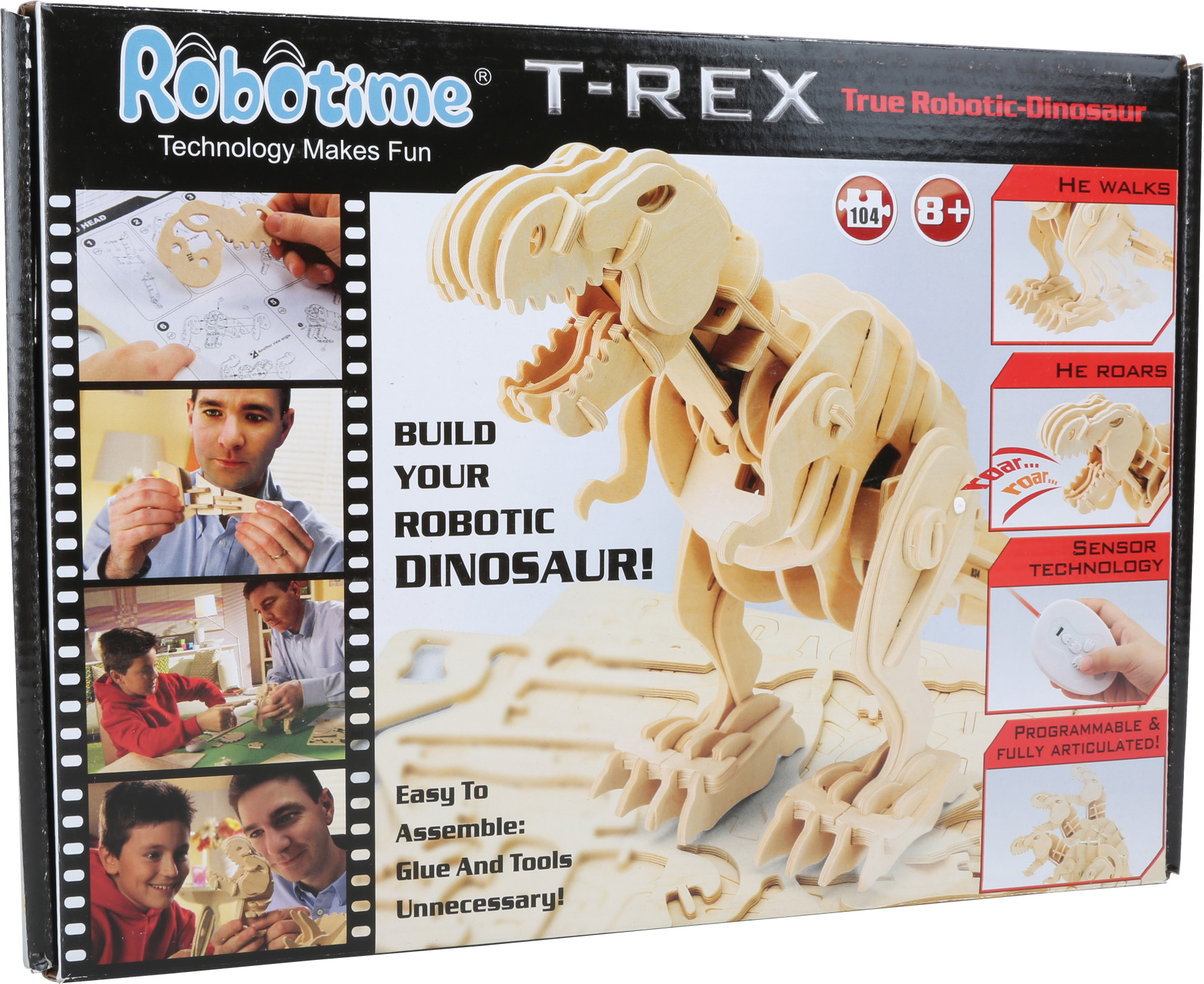 Ce kit en bois est une construction formidable. Le T-Rex en solide bois stratifié est un modèle près de la réalité consistant en 104 pièces. Le clou: le système mécanique incorporé permet à l´aide d´une télécommande la marche du dinosaure. Des sons forts de mugissement soulignent l´originalité. Même la queue et la gueule bougent. Notice de montage comprise. Piles non incluses.