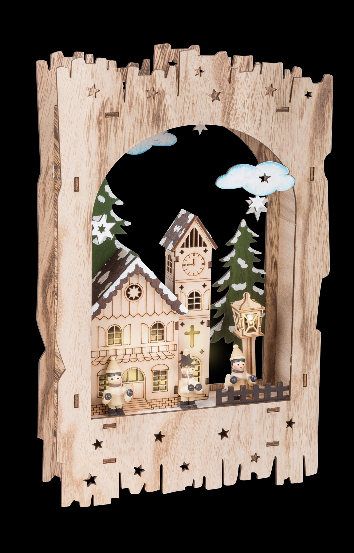 Un village d’hiver avec éclairage. Grâce à l’éclairage LED alimenté par piles, le village, derrière les murs épais de la ville, a l’air bien protégé et accueillant. Piles non incluses. Le paysage encadré ressemble à un cadre en 3D, qui s’intègre à merveille dans la décoration de l’Avent. Un vrai accroche-regard sur le rebord de la fenêtre.