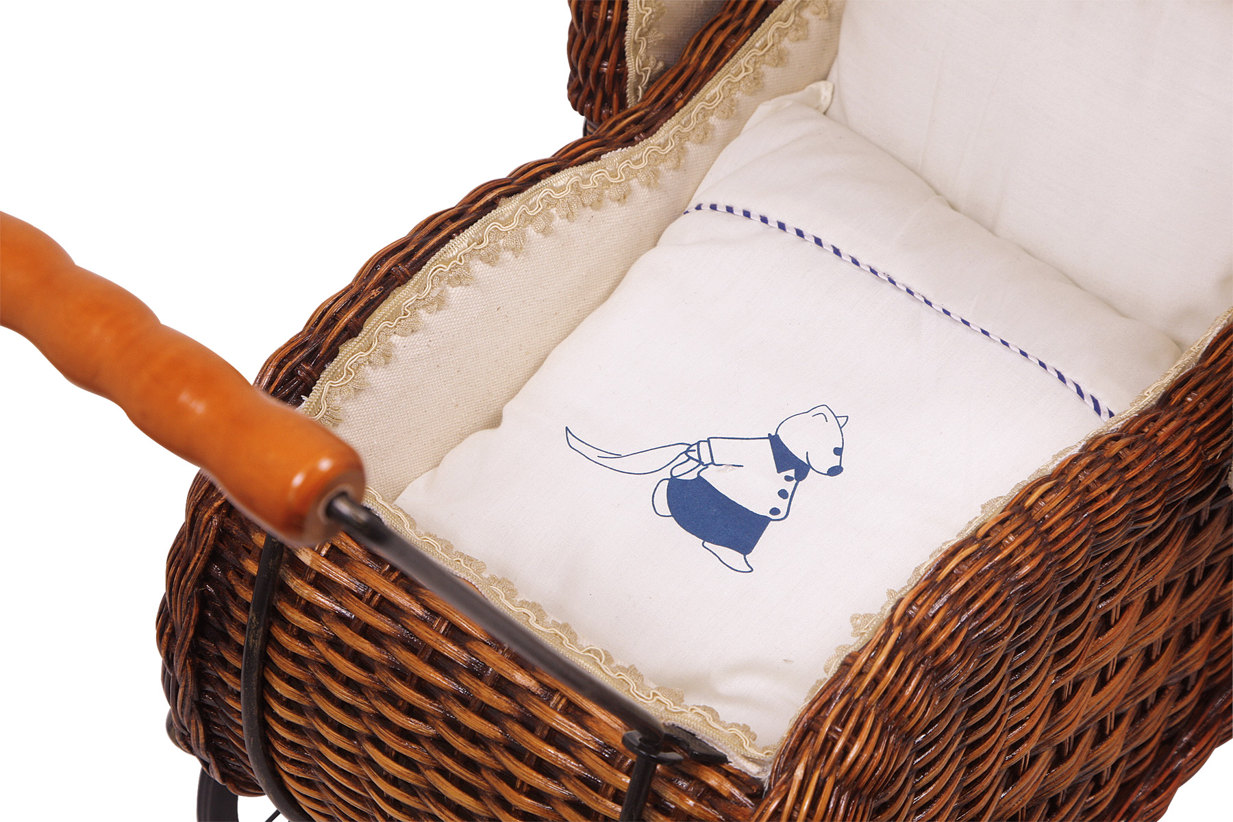Ravissant landau en osier pour mamans de poupées exigeantes ou en guise de décoration. Une douce couverture et des coussins au motif charmant, la structure en métal d‘apparence oxydée ainsi que les garde-boue ajoutent une touche rétro ! Les roues couvertes d’anneaux de caoutchouc assurent des déplacements silencieux dans la maison.