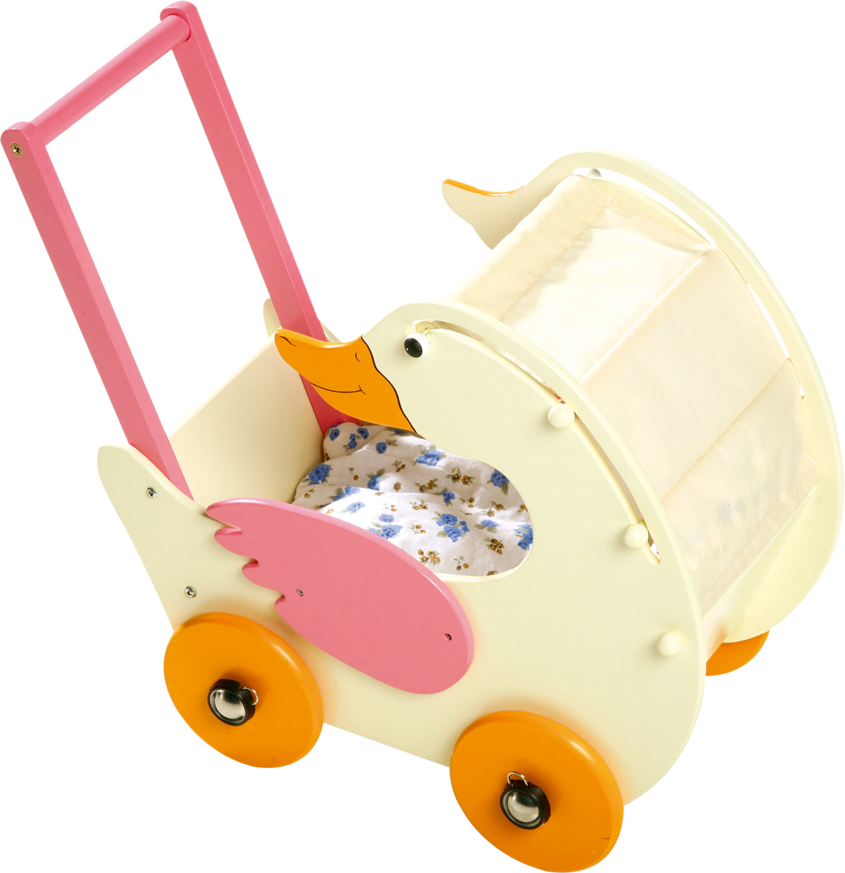 Ce landeau de poupée robuste en bois au design d’une jolie oie avec une capote mobile convient également comme marchette pour bébé ! La literie douce et moelleuse inclue laisse les poupées et peluches rêver. Idéal pour des heures de jeu et de promenade amusantes. Les roues en bois massif, les ailes qui renforcent les côtés et la poignée rose complètent la vue générale de ce landeau de poupée en bois individuelle d’une manière parfaitement optique. Un accroche-regard absolu et le complément idéal pour le théâtre de marionnettes.