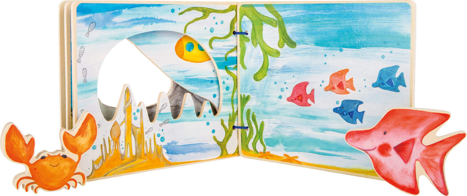 Qu´il y a du monde sous l´eau ! Grâce à ce livre interactif en bois certifié FSC® 100%, les enfants peuvent découvrir les habitants de la mer de façon ludique. Le crabe et le poisson peuvent plonger dans les pages et filer entre elles. Ce monde sous-marin offre diverses possibilités de jeux, laissant ainsi place à la créativité. Sitôt la plongée terminée, les deux amis se fixent grâce au velcro sur le verso de la couverture pour se reposer.
