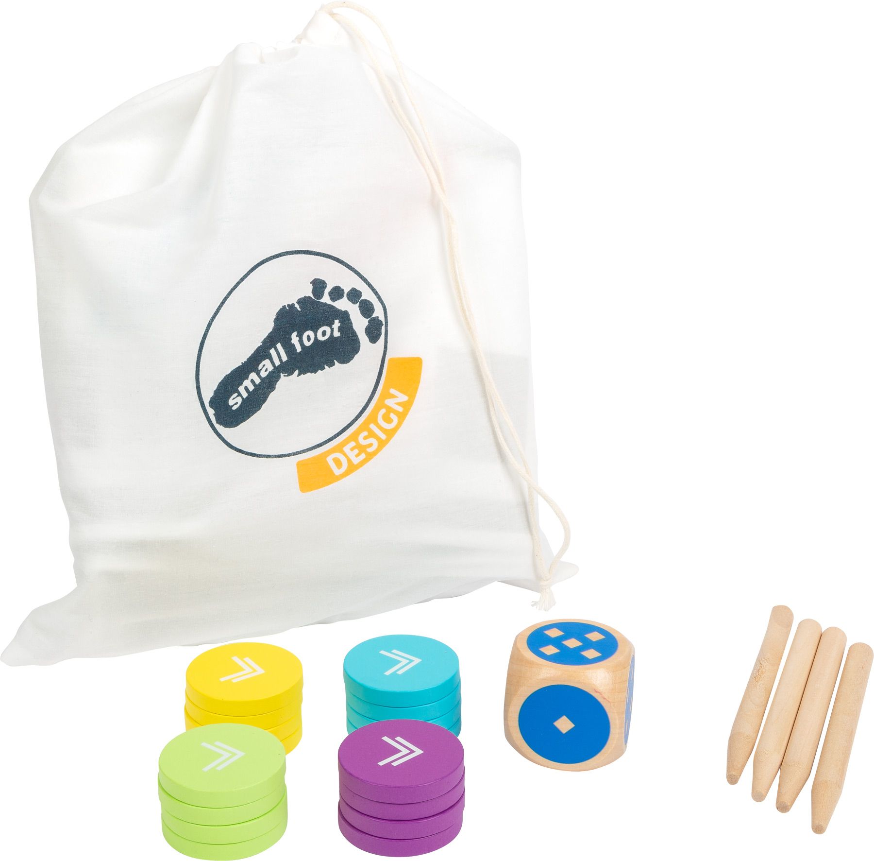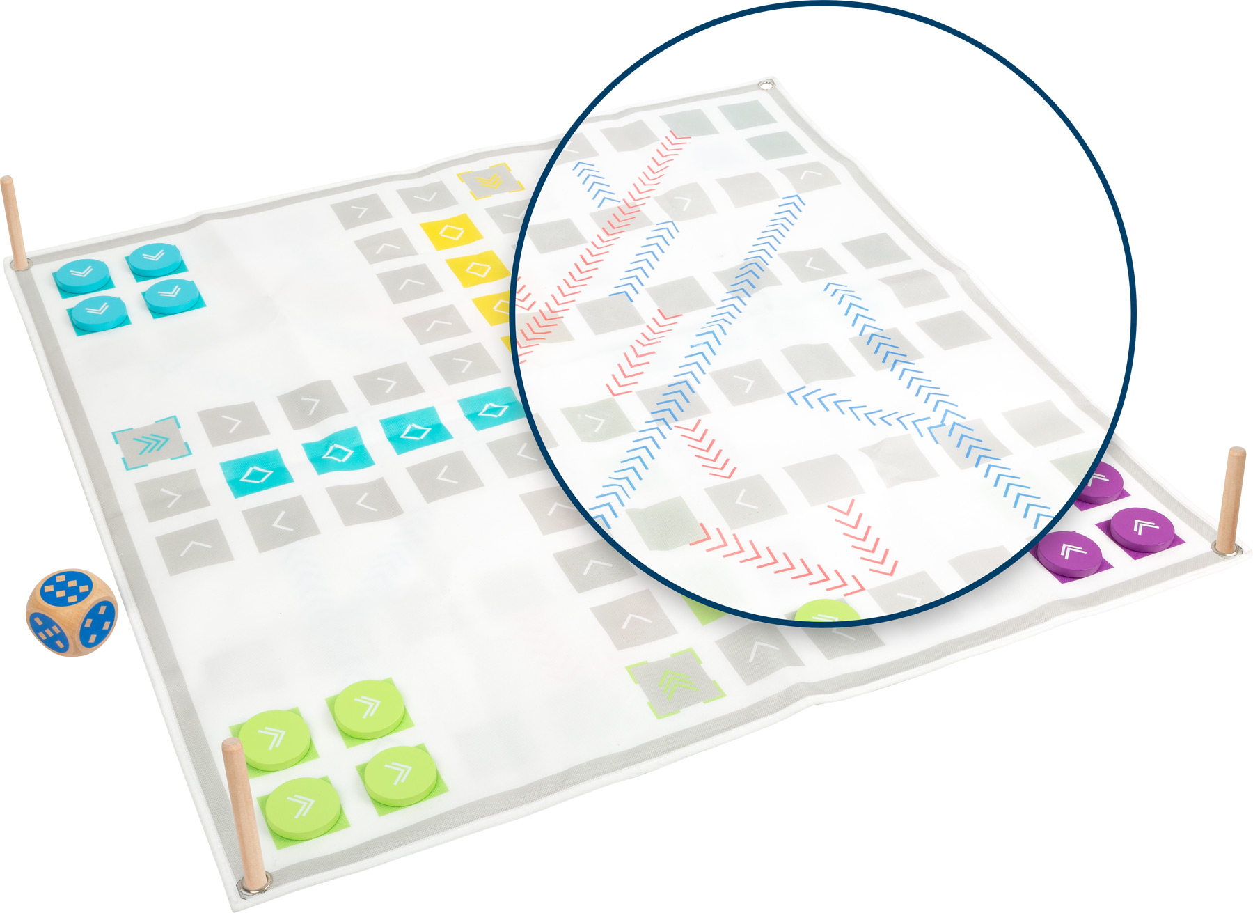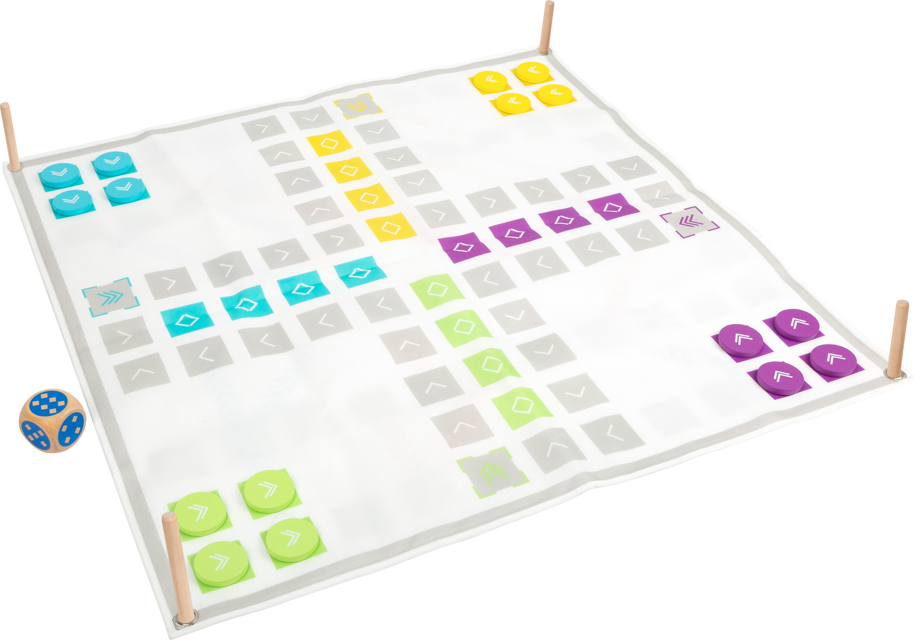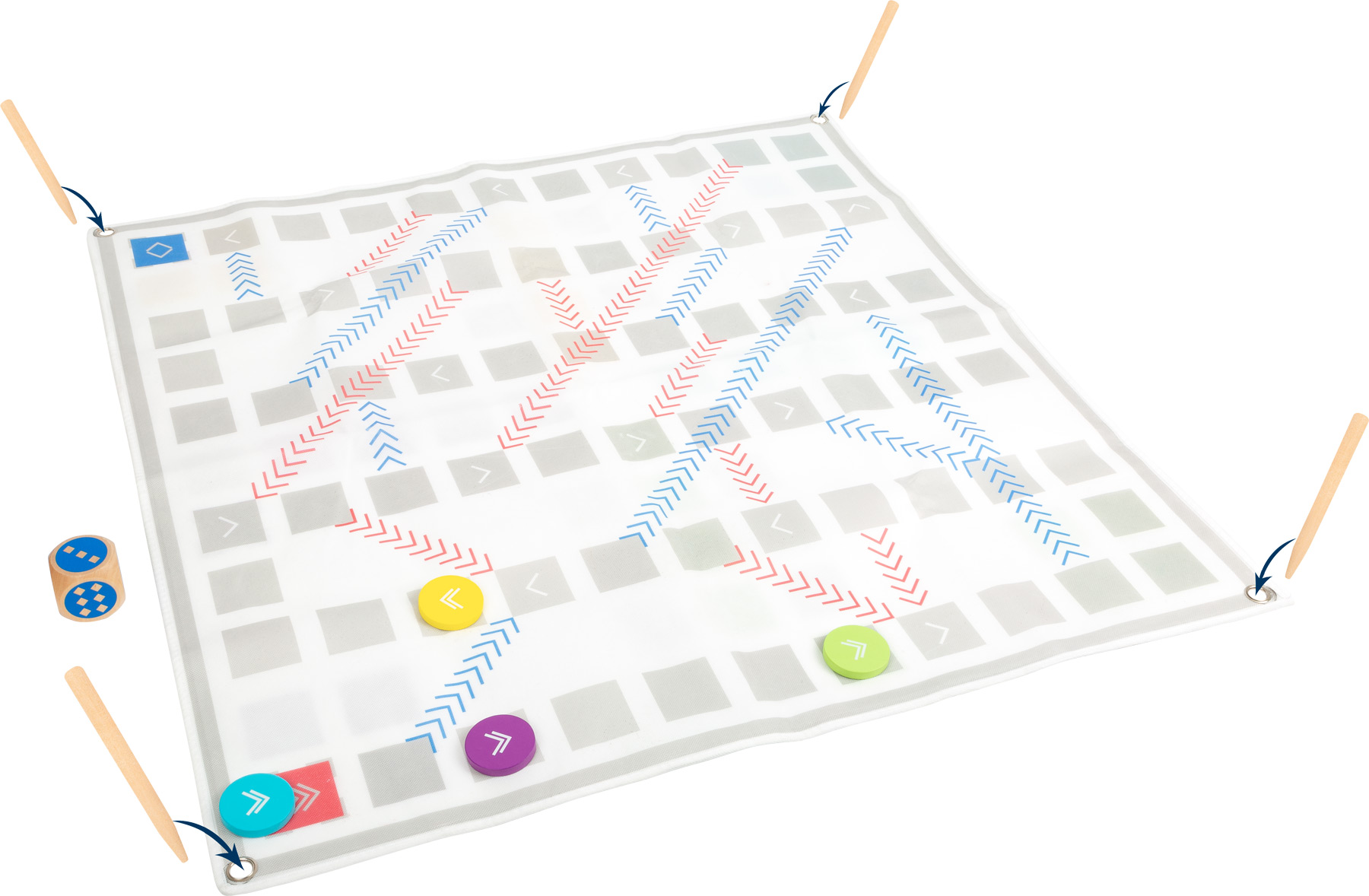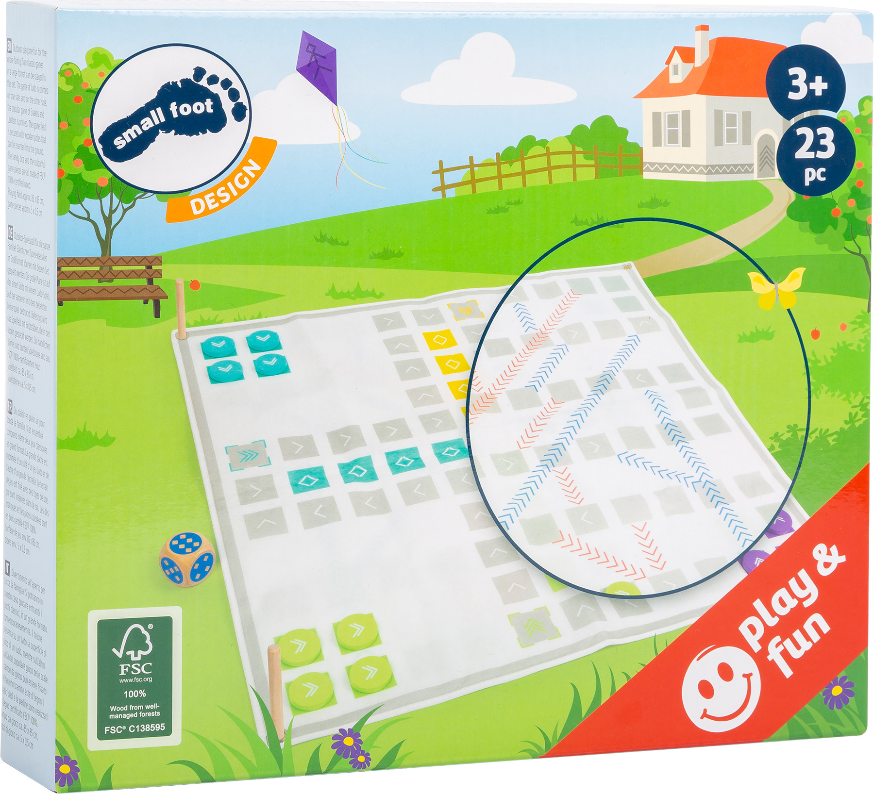 Du plaisir en plein air pour toute la famille! Cet ensemble comprend même deux jeux classiques en grand format. Le terrain de jeu est fixé avec des tiges de bois qui sont insérées dans le sol. Les dés pratiques et les pions colorées sont en bois certifié FSC® 100%. La grande bâche est imprimée d’un jeu Ludo d’un côté et de l’autre d’un jeu de l’échelle. Idéal pour des après-midis amusants dans le jardin !