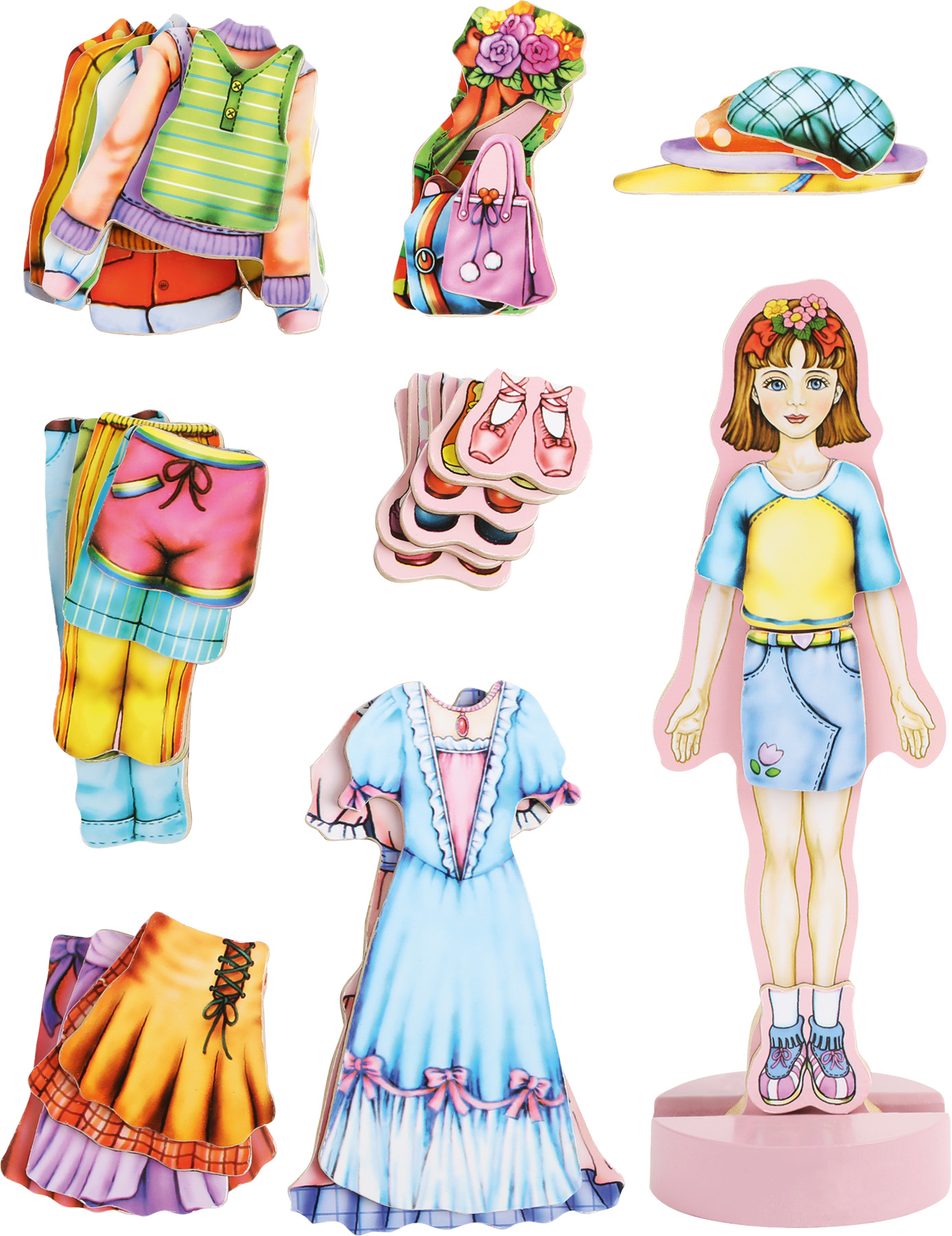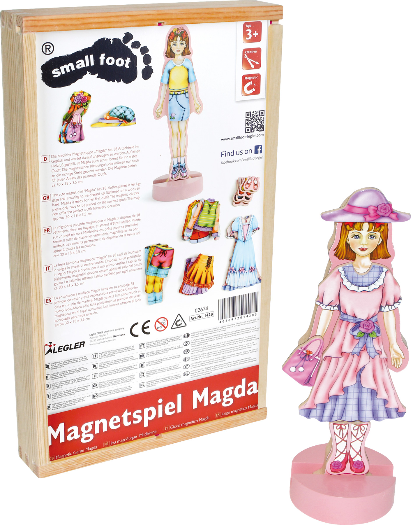 La jolie poupée magnétique « Madeleine » dispose de 34 vêtements dans ses bagages et attend d´être habillée. Placée sur un sopport en bois, Madeleine est prête pour sa première tenue. Il suffit de placer les vêtements magnétiques au bon endroit. Les aimants permettent de disposer de la tenue adaptée à chaque occasion. La petite Madeleine est une poupée tout à fait différente des autres – on la met sur un pied en bois et l‘habille avec des habits aimantés toujours de façon différente! Pantalons, chaussures, chemises, robes et jupes – elle a toujours la meilleure tenue pour le gala, la plage ou les loisirs! « Coller » tout simplement les habits sur la poupée et voir ce qui est à la mode!