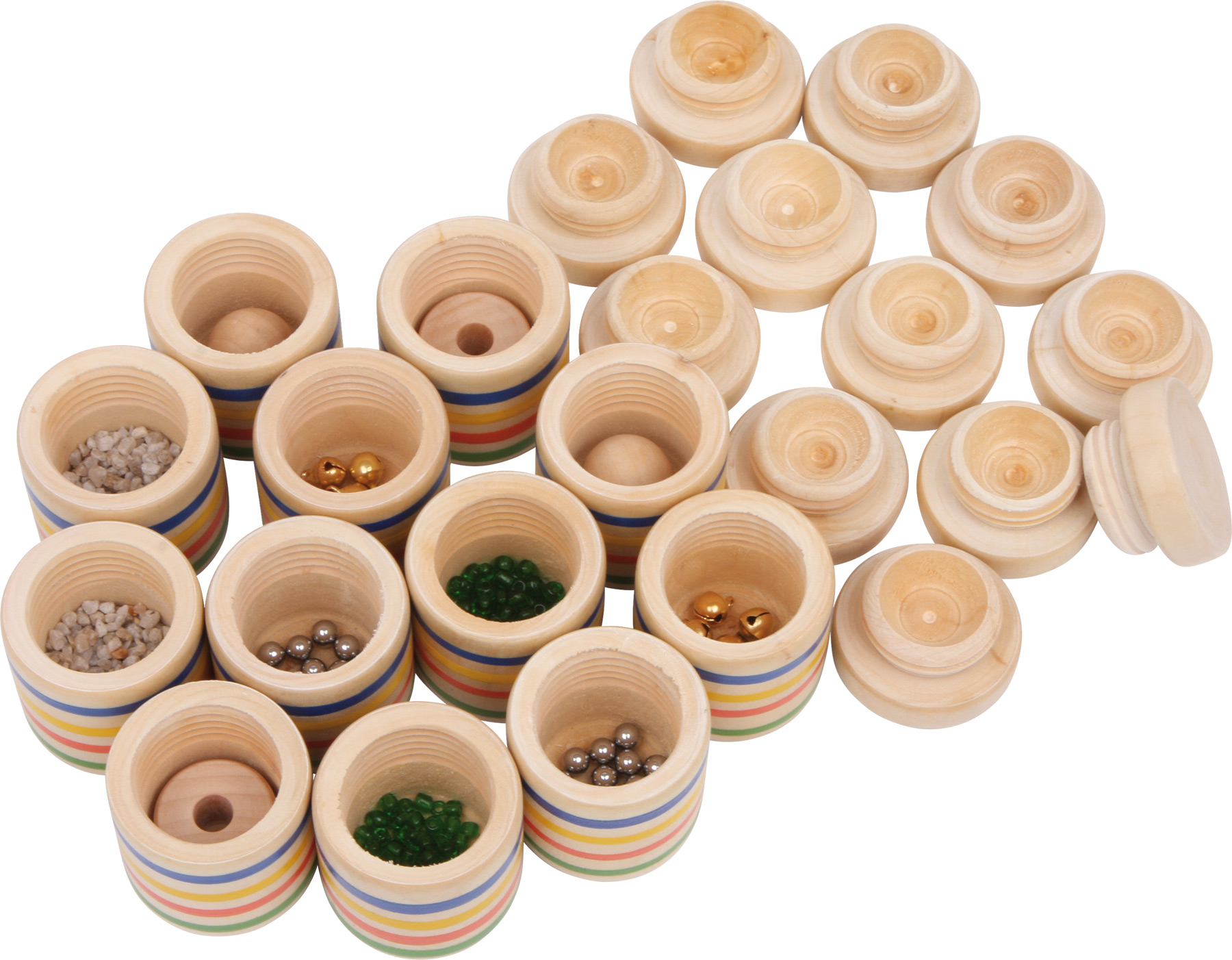 Ces 12 belles boîtes en bois colorées exigent une capacité de mémoire particulière! Toutes les boîtes forment des paires possédant le même contenu et devant être reconnues en comparant les sons qu‘elles produisent! Un anneau en bois n‘a pas le même son qu‘une bille de bois, même chose pour du riz et une petite clochette, ou pour des petits graviers et des perles de verre – entends-tu la différence ?