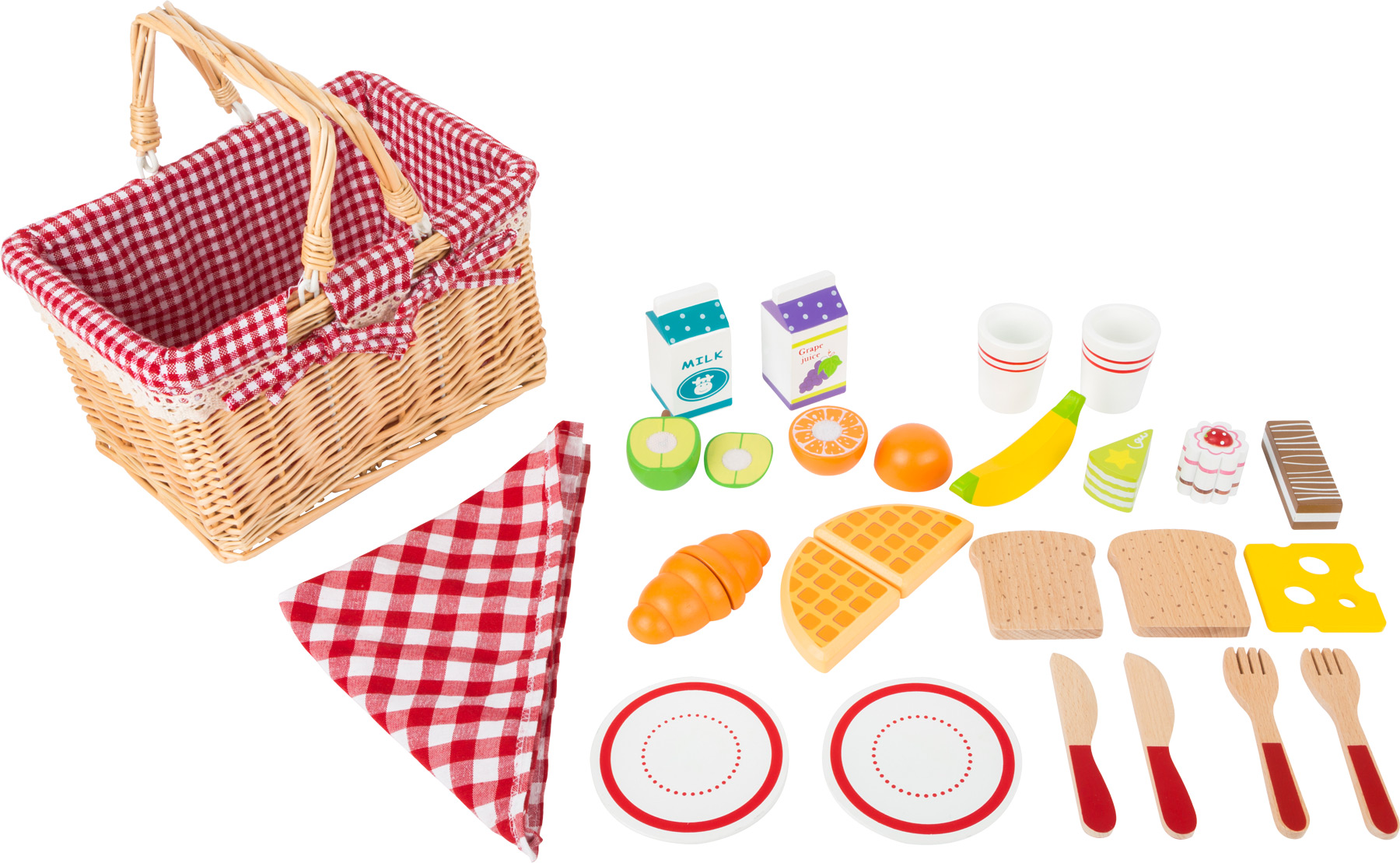 P’tit-déj’ en plein air? Pourquoi pas! Ce panier de pique-nique en aspect osier avec couverture assortie est parfait pour la prochaine excursion ! La vaisselle de pique-nique en bois et plein de bonnes choses à manger sont inclus ! Les fruits et le croissant peuvent être coupé en deux grâce à une fermeture velcro. Ce panier en plastique avec aspect osier est particulièrement robuste. Avec ses poignées repliables, il est parfaitement adapté pour être transporté dans les plus belles aires de pique-nique. La doublure intérieure à carreaux est amovible et donc facile à nettoyer. Ne perdons pas de temps! Déplions la couverture et mettons-nous à l’aise!
