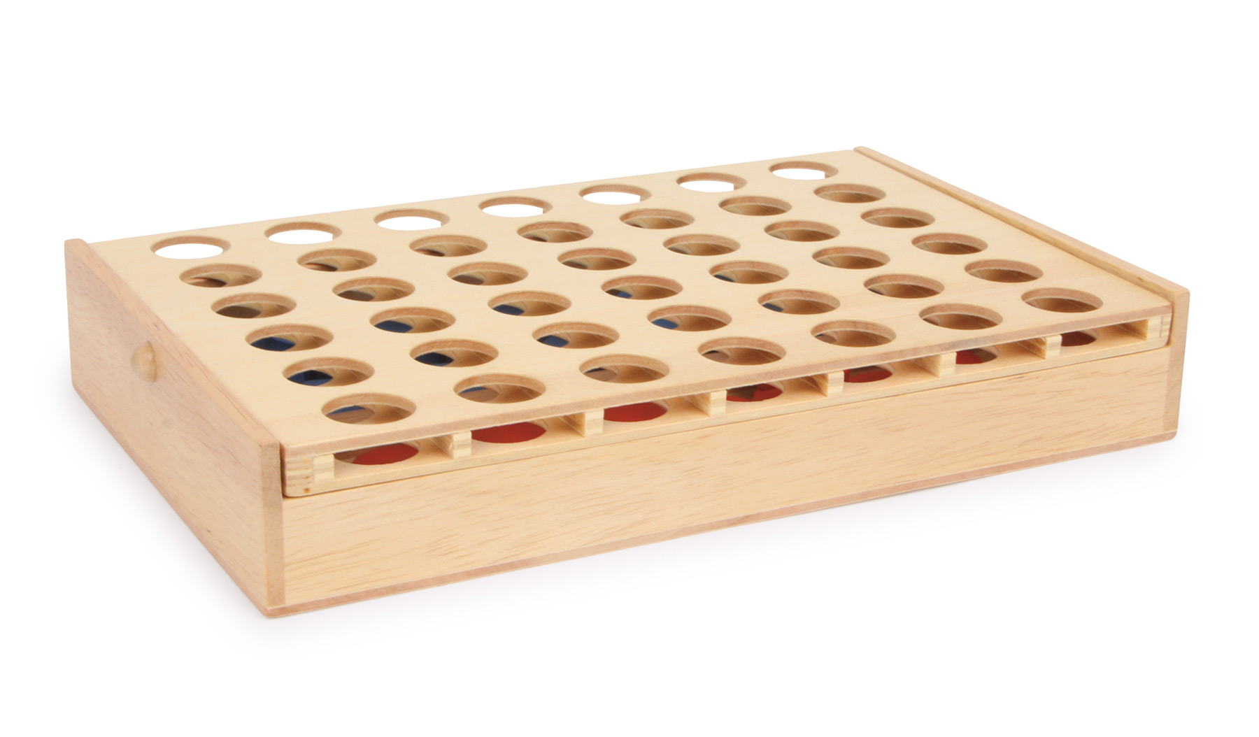 Une version en bois d´un amusant jeu de société classique. Le but du jeu est d´être le premier à créer une rangée de quatre pions de sa couleur, peu importe si c´est une rangée horizontale, verticale ou diagonale. Un superbe jeu très divertissant pour petits et grands. Le jeu classique populaire en petit format pour le voyage. Pions et plateau en bois. Pour vider la grille de jeu, il suffit de la pencher.