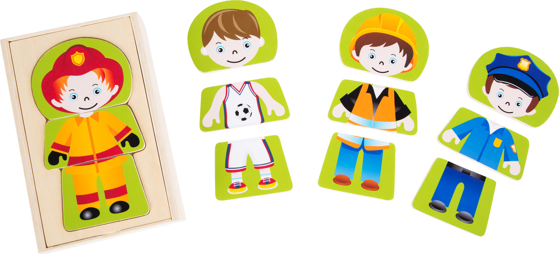 Pompier ou ouvrier du bâtiment – quel est ton métier de rêve? Ce puzzle à habiller en bois verni propose quatre métiers avec leurs tenues de travail classiques. Chaque tenue est composée de trois pièces qui peuvent être combinées à volonté: le pompier peut par exemple porter des baskets ou le footballeur des chaussures de sécurité. Dans le couvercle de la boîte en bois se trouve un emplacement pour ranger les pièces de ce drôle de puzzle. Amusement garanti avec ce puzzle à habiller !