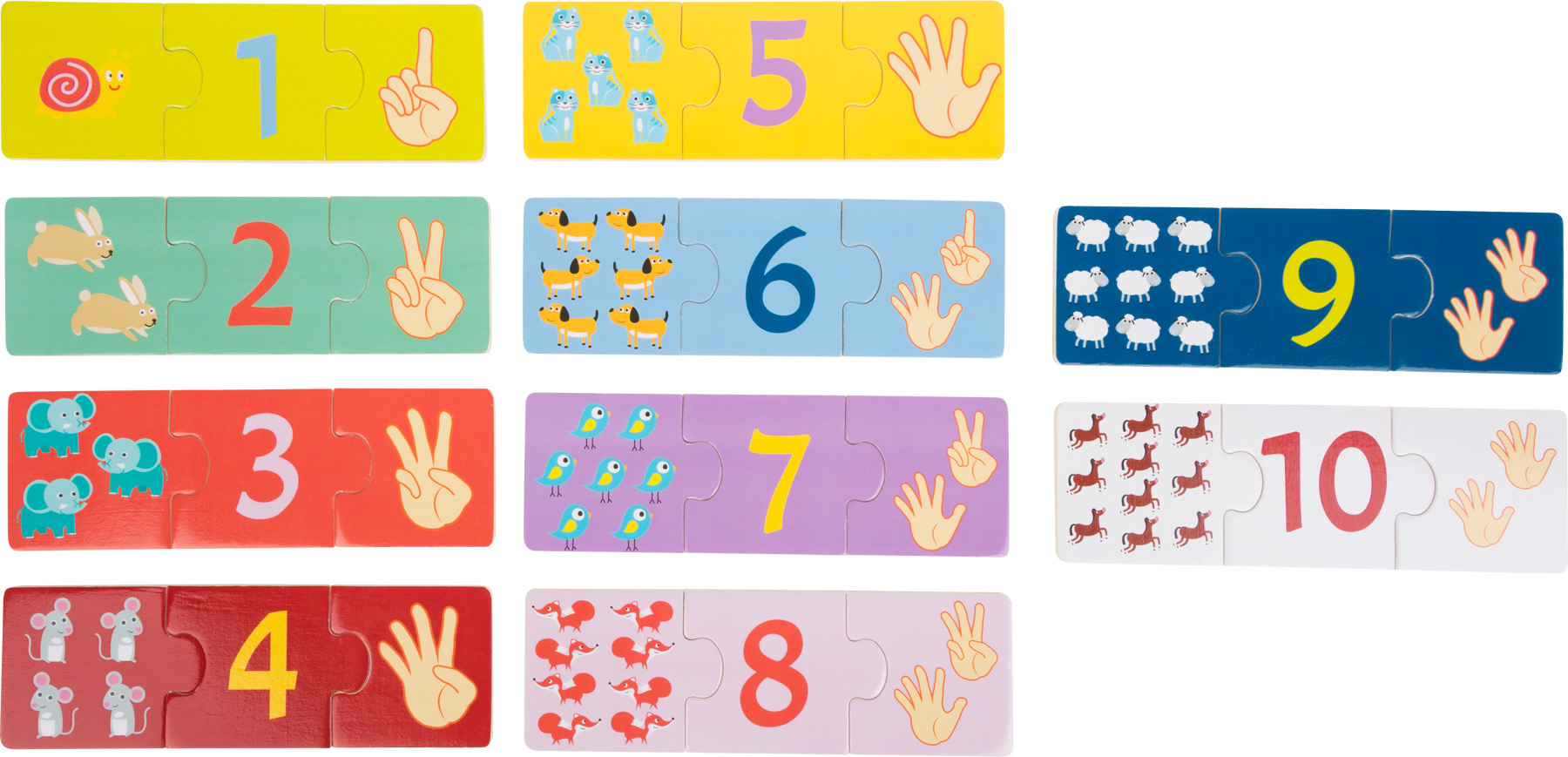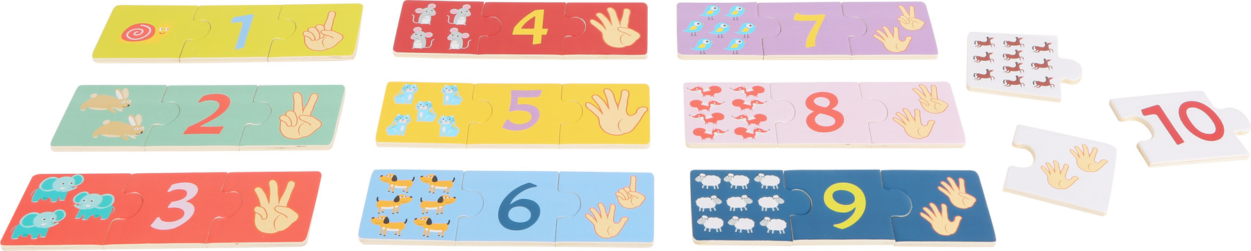 30 Pcs. Viens, on compte! Ce beau puzzle éducatif en bois aide les petits pros des maths à découvrir le monde des chiffres et à apprendre à compter. Il faut rassembler à chaque fois trois pièces avec les chiffres correspondants. Avec ce puzzle, on peut également jouer au mémo. Sur les pièces de puzzle stables et joliment colorées figurent les chiffres de 1 à 10 en trois variantes différentes, ce qui forme en plus la concentration et la motricité fine. De cette façon, l’enseignement est combiné avec un jeu divertissant. Ce puzzle est parfait pour mémoriser et s’entraîner !