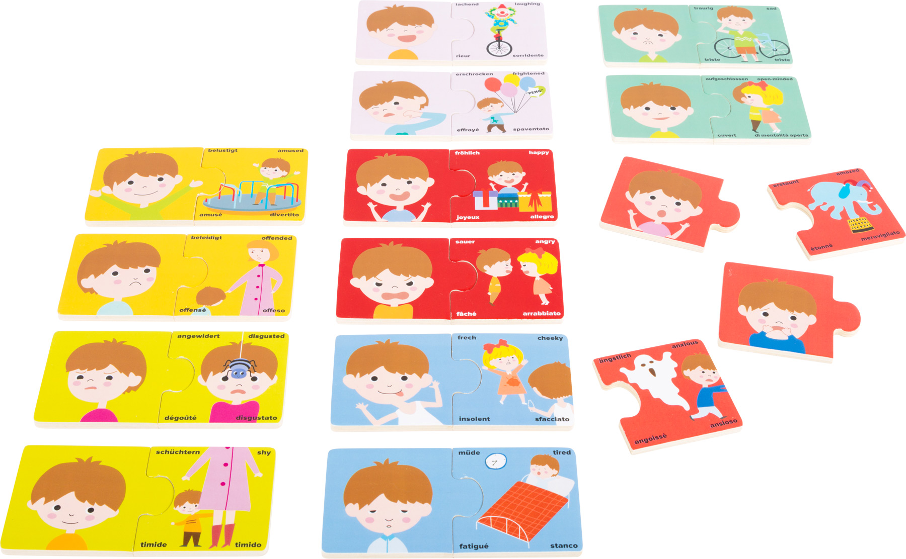 28 Pcs. Fatigué, triste, heureux, inquiet… Exprimer et reconnaître les émotions est souvent difficile pour les enfants. Ce puzzle éducatif en bois leur apprend les émotions tout en jouant. Avec ce puzzle, on peut également jouer au Memory. Les noms sont écrit en 4 langues (anglais-allemand-français-italien). Le puzzle demande en plus de nommer les situations présentées et forme donc la compréhension et l’intelligence émotionnelle. Le puzzle avec ses pièces en bois colorées avec beaucoup de détails et qui tiennent bien en main montrent une émotion par une expression du visage et par une situation qui doit être mises en paires. Il entraîne également la motricité fine – le jeu parfait surtout pour les petits au kindergarten!