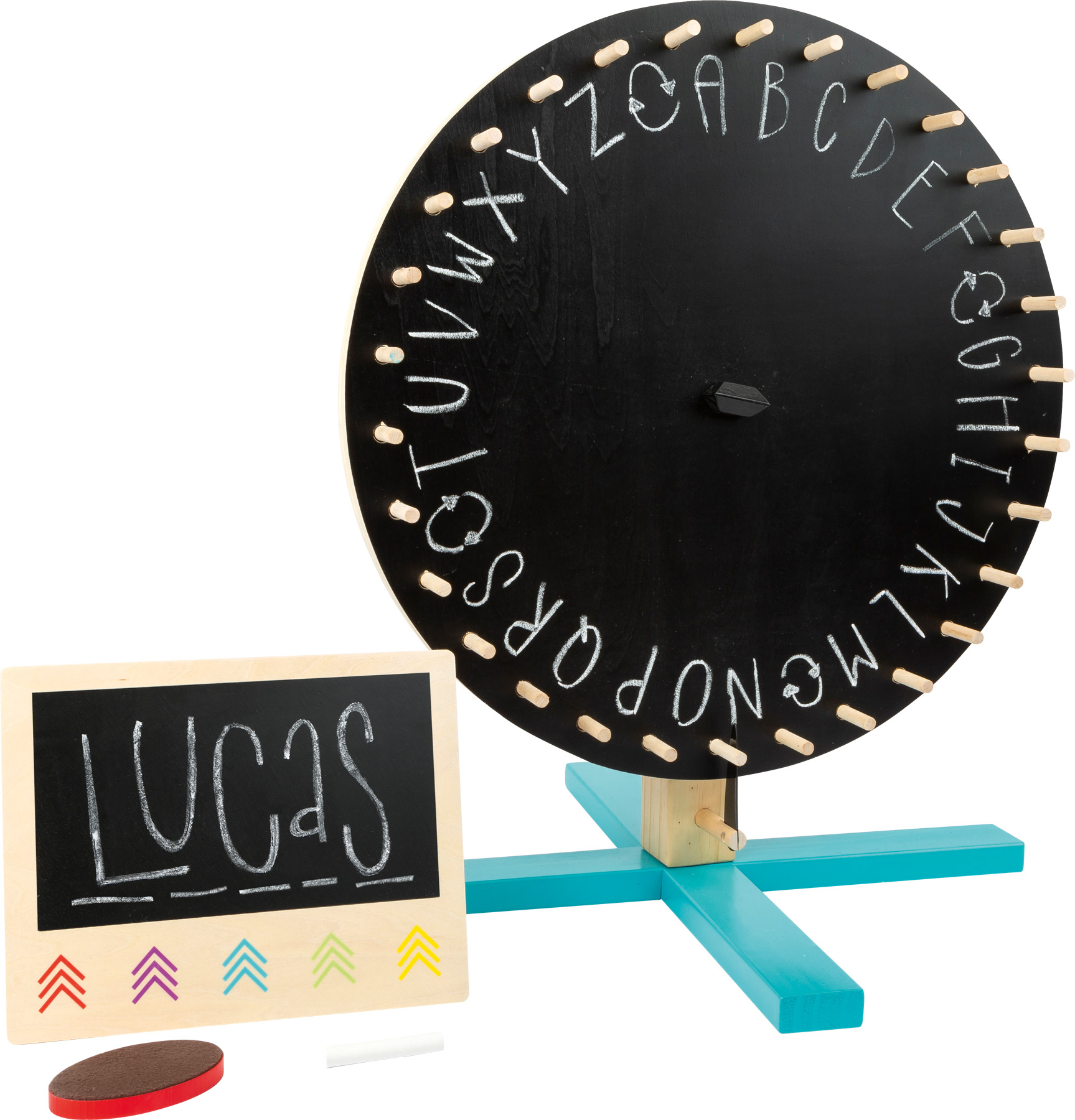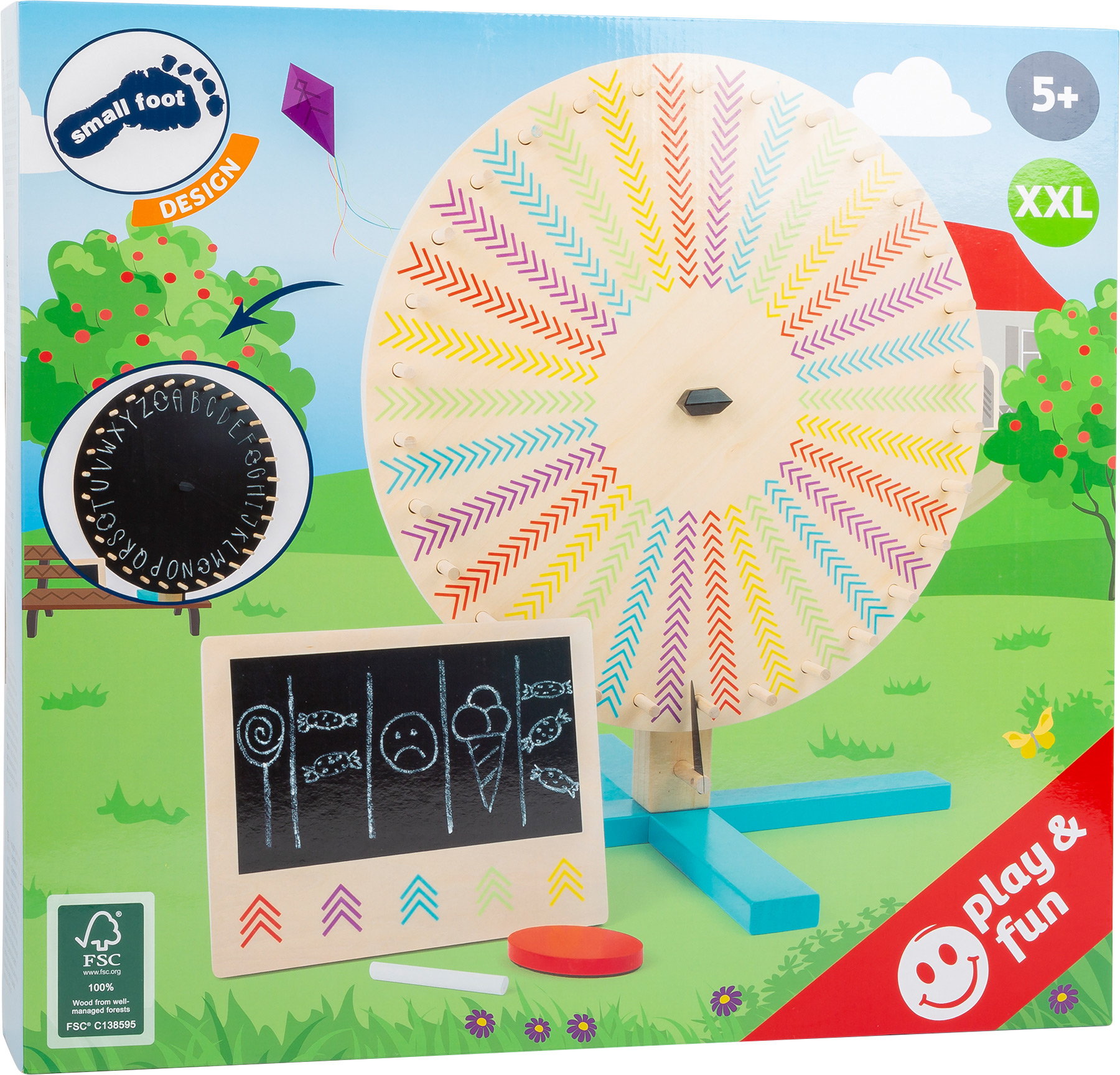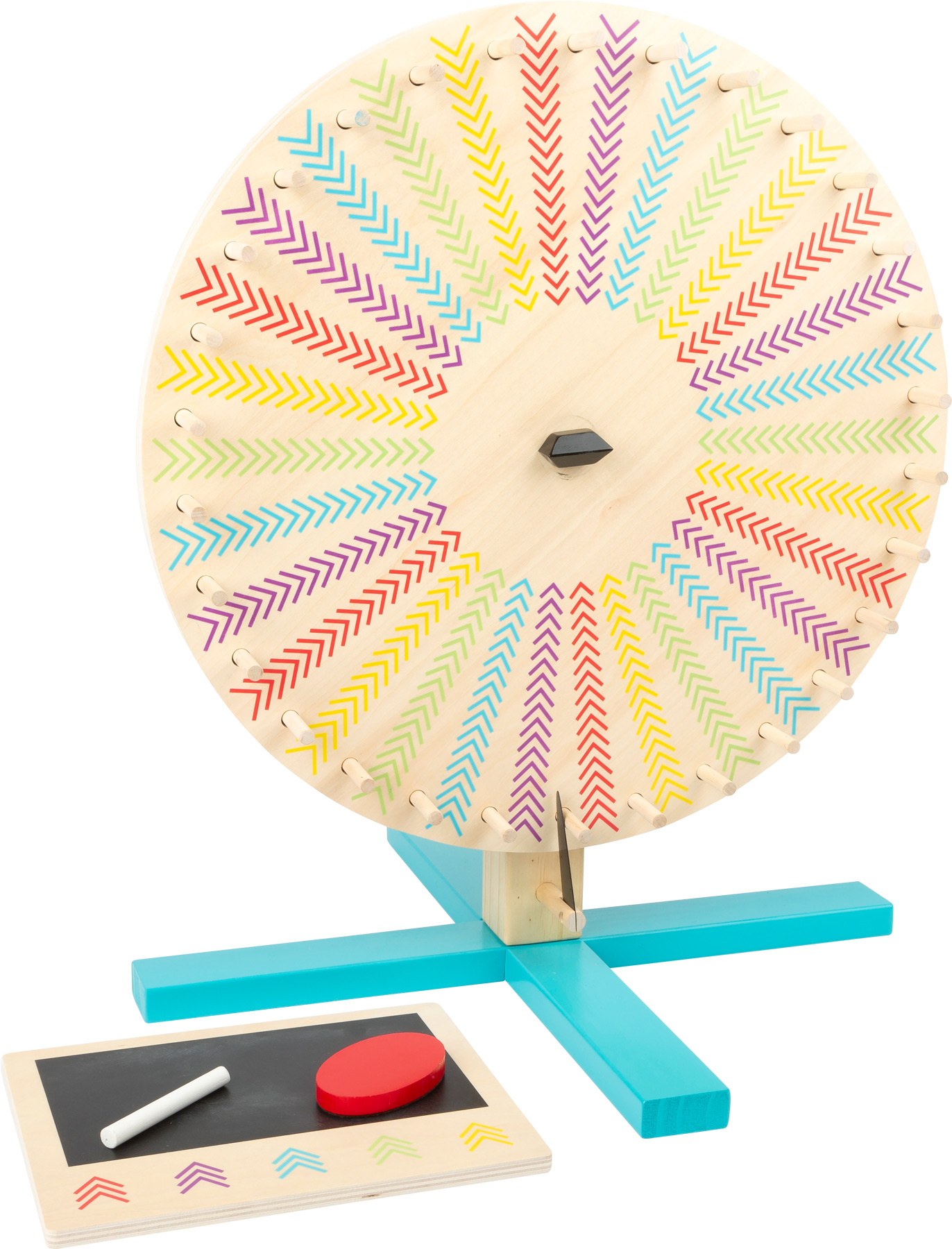 Chaque tir est gagnant! La roue de la fortune en bois certifié FSC® 100% est livrée avec un disque tournant réversible et facile à transformer. Le disque est équipé d´un côté avec 30 champs de couleurs et de l’autre côté avec un tableau noir. Cela signifie que vous pouvez créer votre propre répartition. Sur le petit tableau, les équipes et les points peuvent être notés afin de couronner le vainqueur à la fin! La roue de la fortune est idéale pour des parties de jeu amusantes dans la chambre d´enfant, pour des loteries en maternelle ou pour la fête d´anniversaire des enfants !