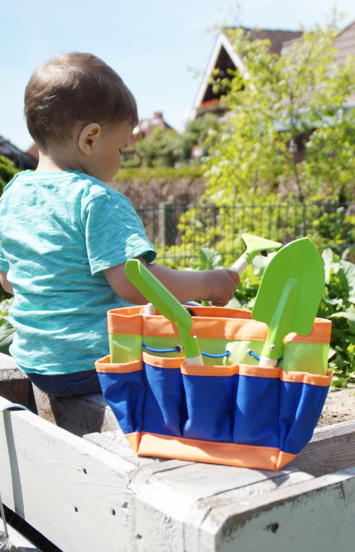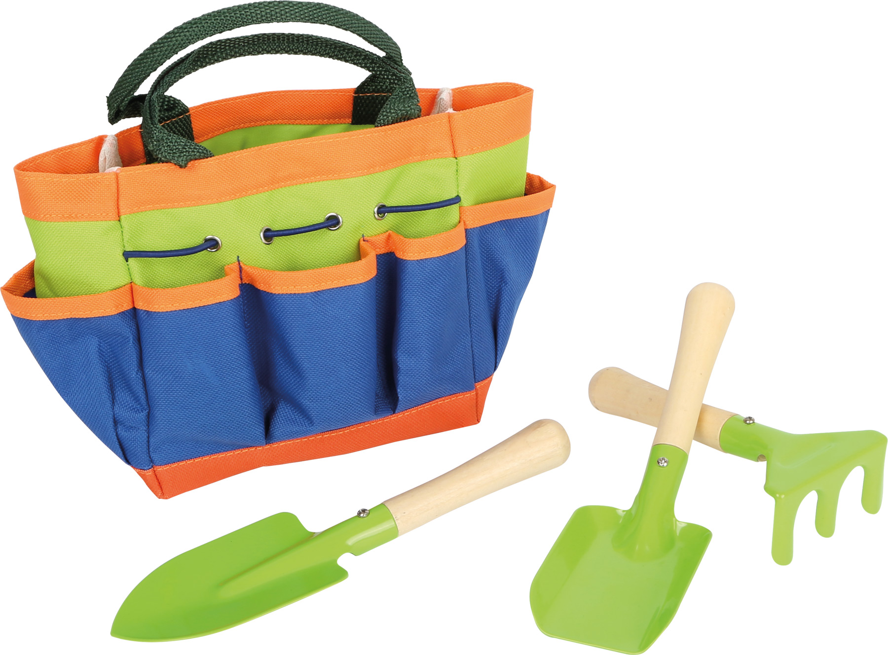 Jardinage to go ! Avec ce sac de jardinage qui contient pelle, râteau et bêche, tous les petits jardiniers sont bien équipés pour travailler dans le jardin. Le sac est facile à nettoyer et offre suffisament de place pour les trois outils qui servent à planter des fleurs et à prendre soin des plantations. Les outils sont fabriqués en bois robuste et en métal et tiennent bien dans les mains d’enfant.