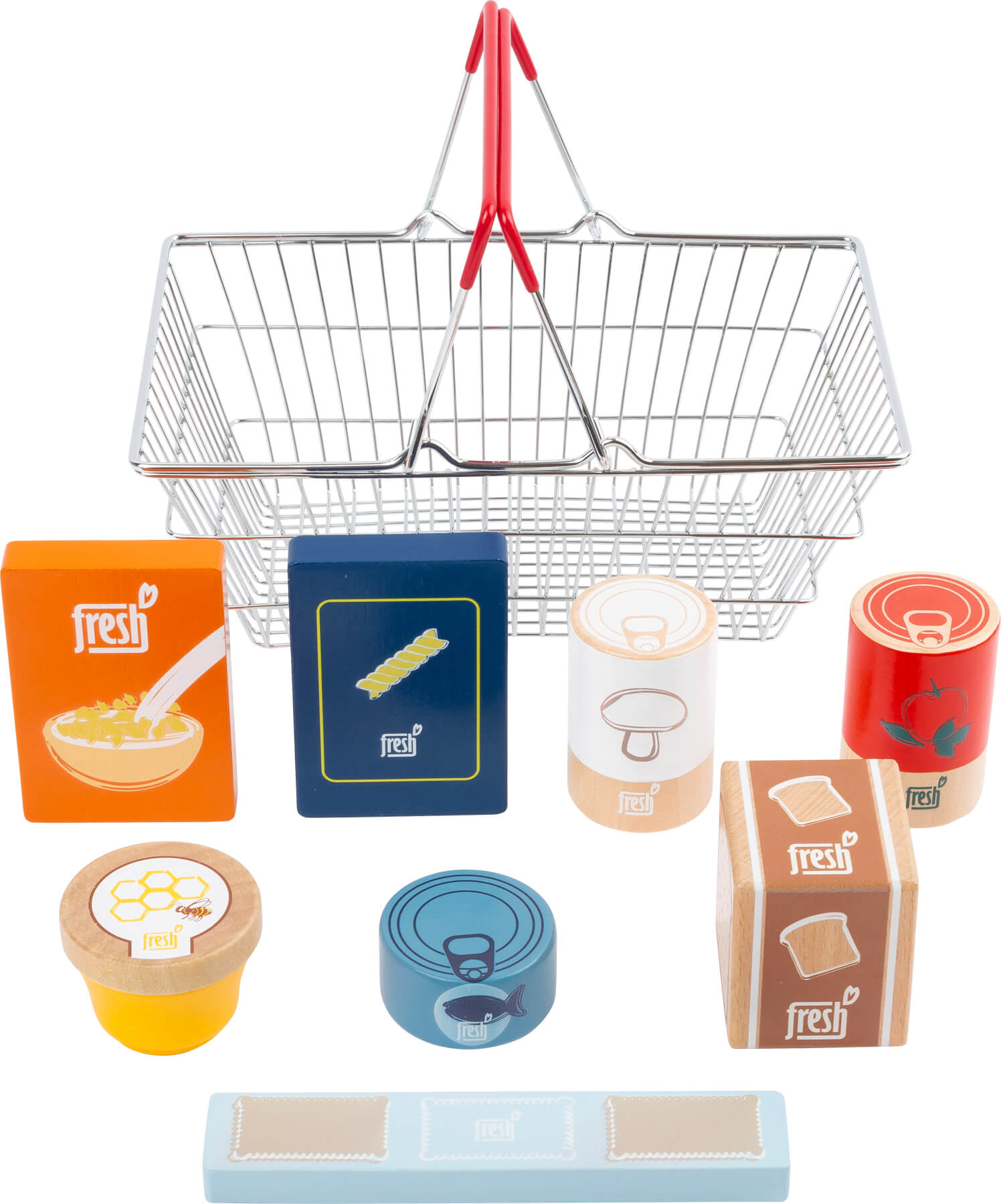 Grandes courses pour le garde-manger ! Cet ensemble de 9 pièces contient un pain complet, des céréales, des nouilles, du thon, de la sauce tomate et des champignons en boîte, ainsi que des biscuits et un verre de miel fait de bois soigneusement conçu. Avec le panier en métal de haute qualité, les courses hebdomadaires dans le magasin se font rapidement ! Conçu dans des couleurs typiques des produits et avec une forte teneur en bois visible, cet accessoire de cuisine de magasin et de jeu a un aspect particulièrement soigné et garantit un plaisir de jeu extra-long.