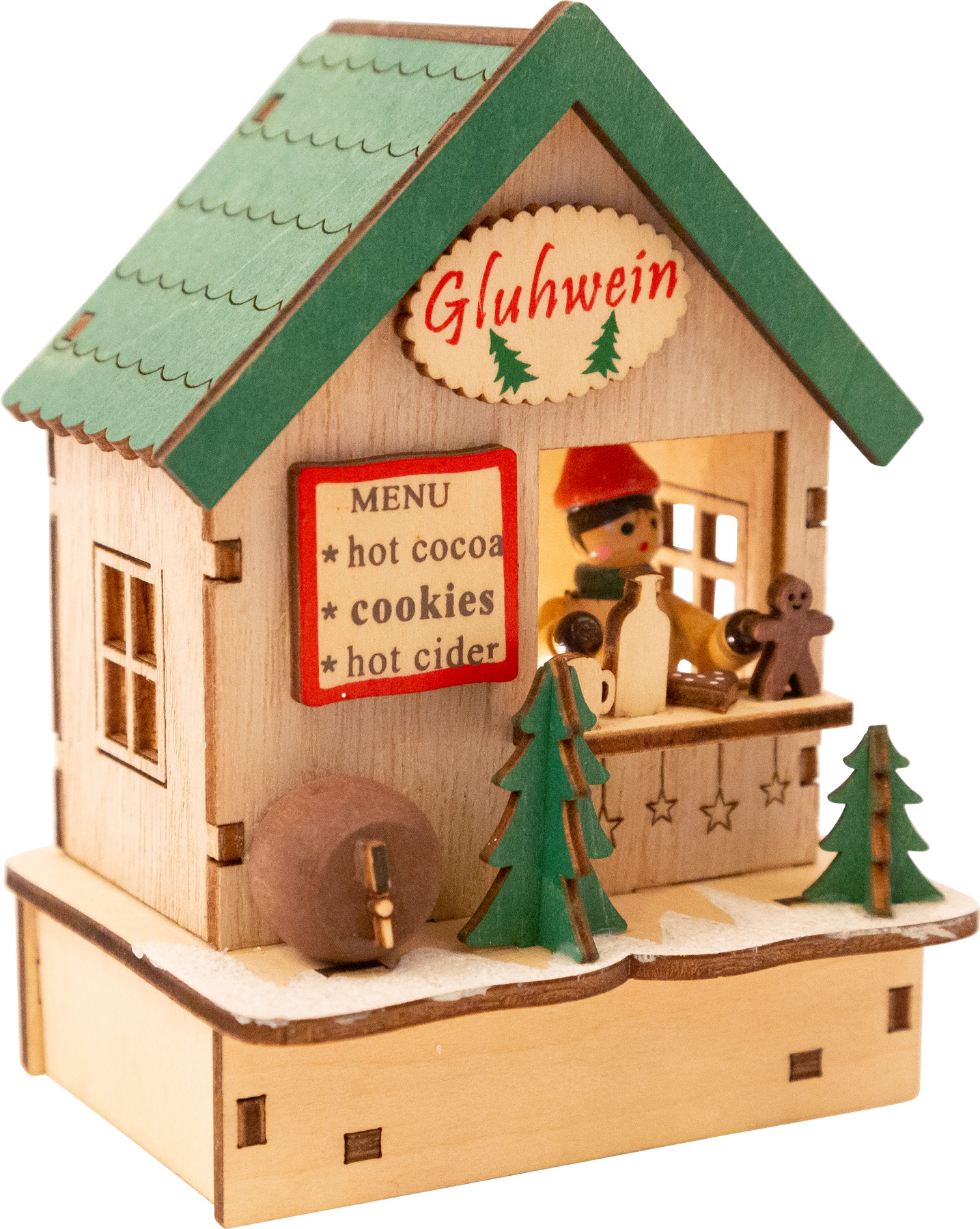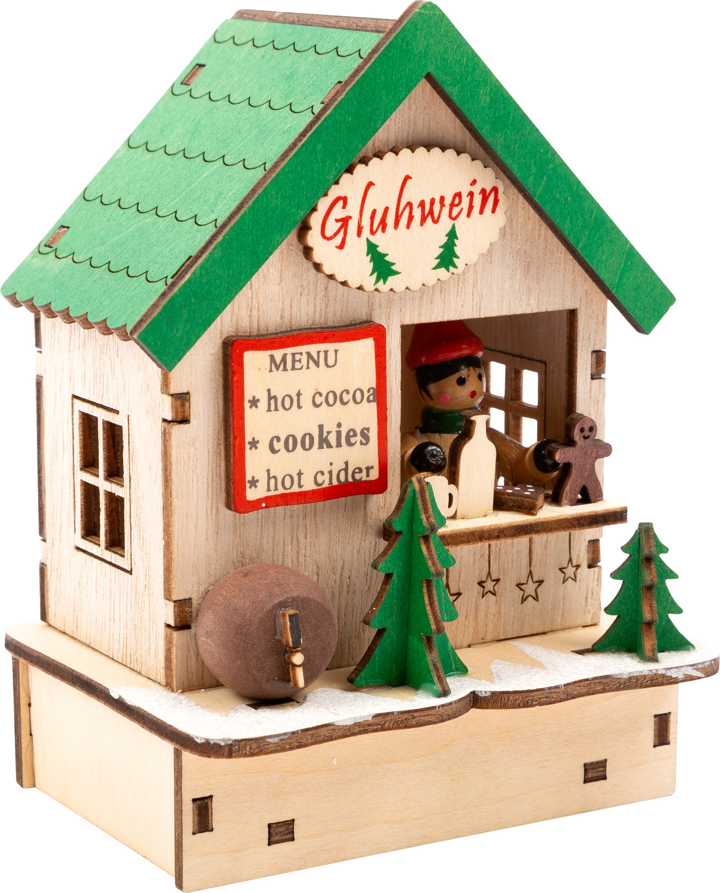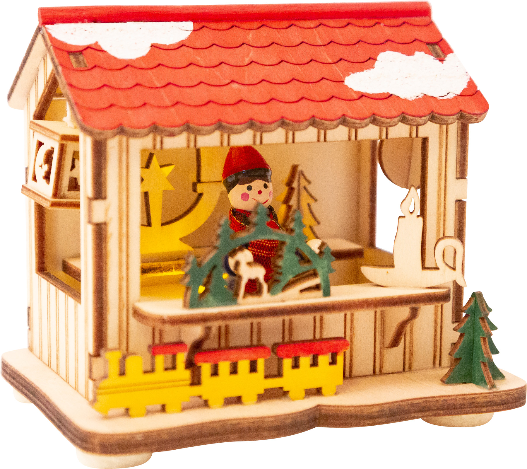 Marché de Noël à la maison ! Les trois petits chalets en bois sont travaillés en filigrane et savent convaincre par leurs précisions fait avec amour. L’éclairage indirect à piles dans les chalets et la neige scintillante créent une belle atmosphère de Noël. Piles non incluses. La décoration idéale pour la saison hivernale !