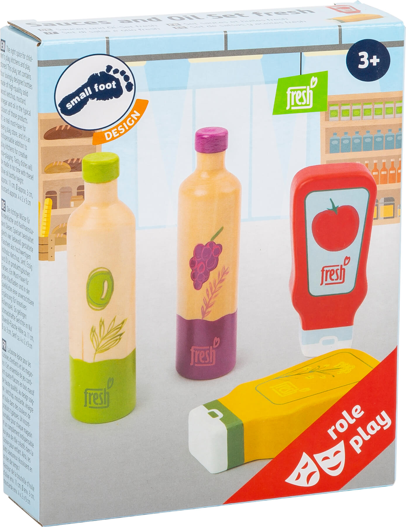La bonne épice pour les cuisines d’enfants et les magasins! Cet ensemble de jeu contient quatre bouteilles en bois de haute qualité, au design soigné: ketchup, moutarde, vinaigre et huile dans des couleurs de produits typiques. Un incontournable pour chaque magasin et cuisine d’enfants. Pour des jeux de rôle créatifs ! Ainsi, les plats savoureux réussissent en un rien de temps! Grâce aux illustrations claires et faciles à comprendre, même les enfants qui ne savent pas encore lire peuvent facilement comprendre ce que contiennent les bouteilles.