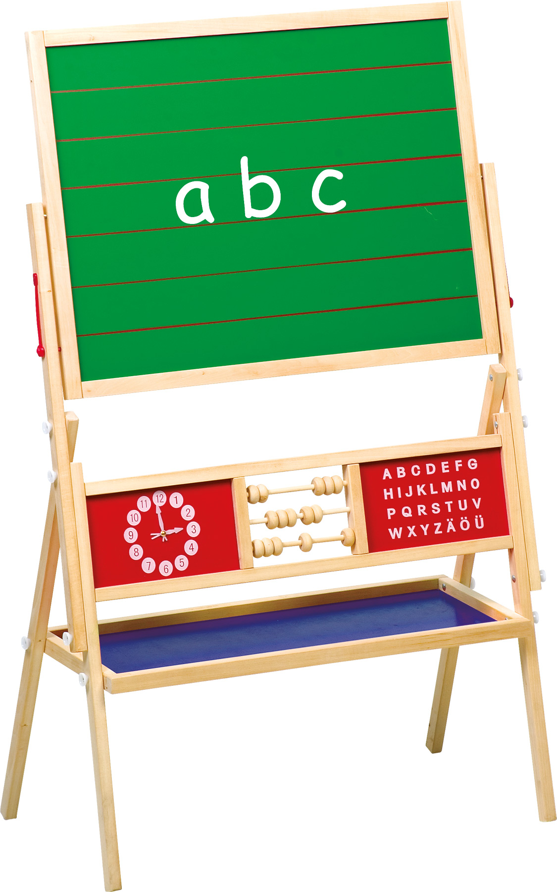 Un tableau réversible avec une face craie et une face magnétique avec cadre, casier, boulier, horloge et tableau lettres. Tableau classique sur une face et surface magnétique pour écrire sur l’autre face. Ce tableau fait entrer l’école dans la chambre d’enfant! Quels jeux enthousiasmants pour se préparer à la scolarisation! Et un moyen parfait pour les petits de faire preuve de leur dextérité vis-à-vis d‘une foule de spectateurs!