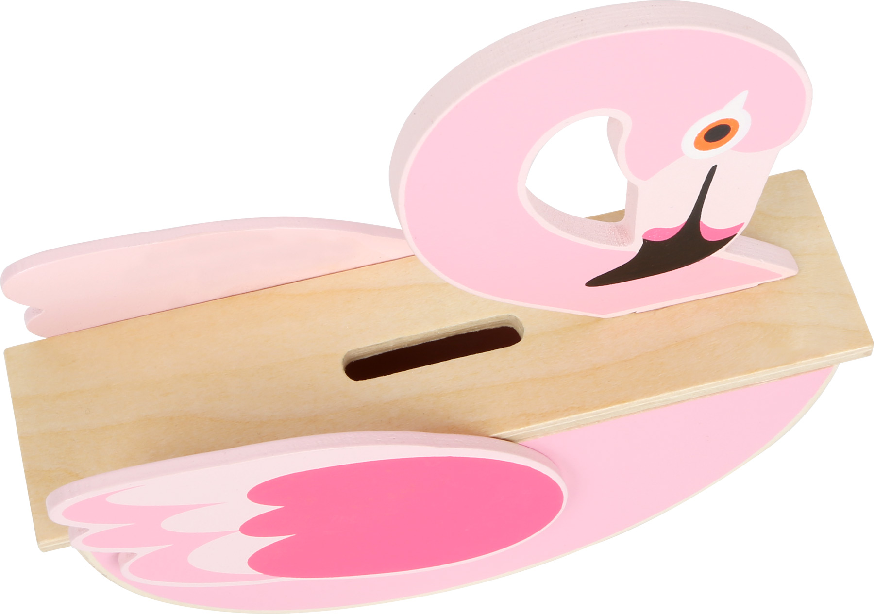 Avis aux futés de l’épargne ! Cette tirelire en bois en forme de flamant rose se réjouit de chaque pièce épargnée. La grande fente facilite également l’insertion des billets pliés. Lorsqu’on insère des pièces, le flamant rose est tellement content qu’il commence à se balancer. Sur le dessous de la tirelire se trouve un bouchon en caoutchouc, pour pouvoir extraire facilement l’argent épargné. Et maintenant : Amusez-vous bien en épargnant !