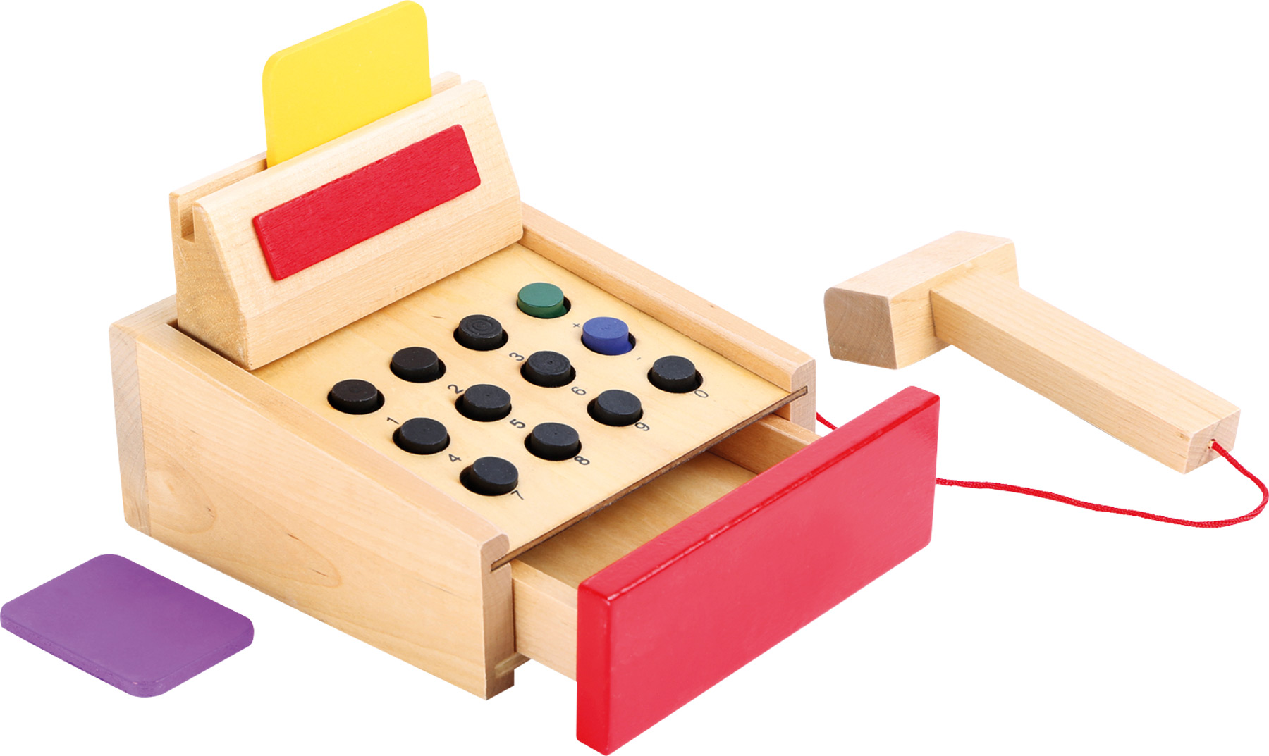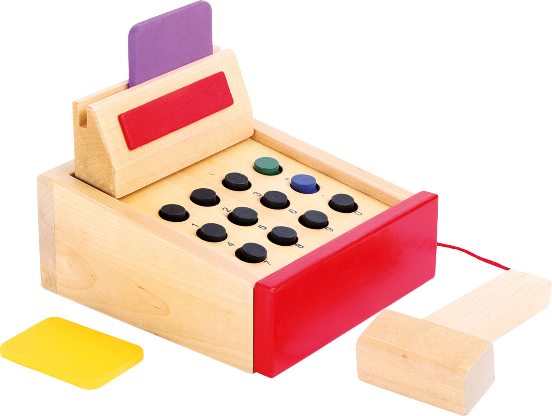 Une vraie caisse de pro! Les enfants apprenent à entrer les prix, ranger les billets et les pièces mais également à débiter les cartes. La caisse en bois comprend un tiroir, des touches en bois, des cartes bleue et jaune et un scanner en bois. Tout ce dont le marchand a besoin pour bien facturer les clients! Le tiroir offre assez de places pour les billets et les pièces de monnaie factice.